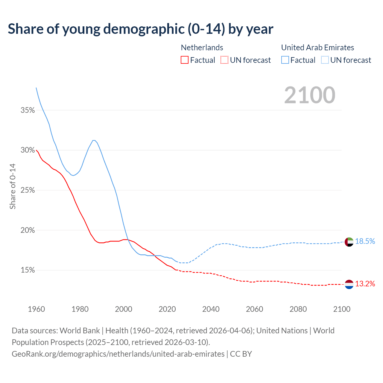 - The share of young demographic (0-15 years old) in the Netherlands is 15% vs 16.1% in the United Arab Emirates.