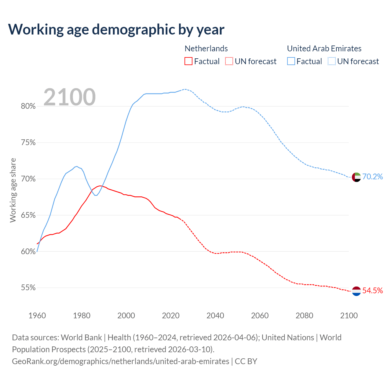 Median age Netherlands vs United Arab Emirates, 1960-2100