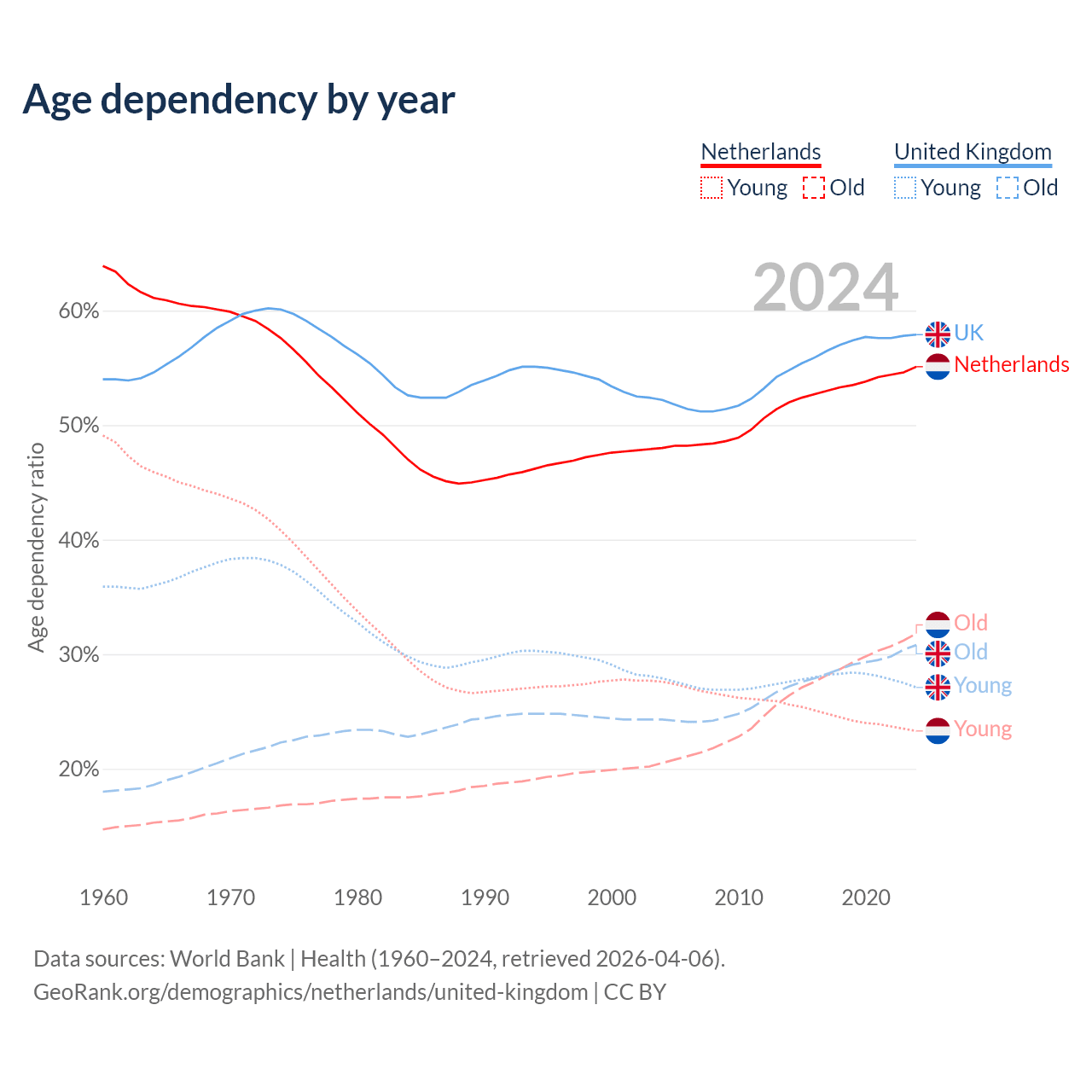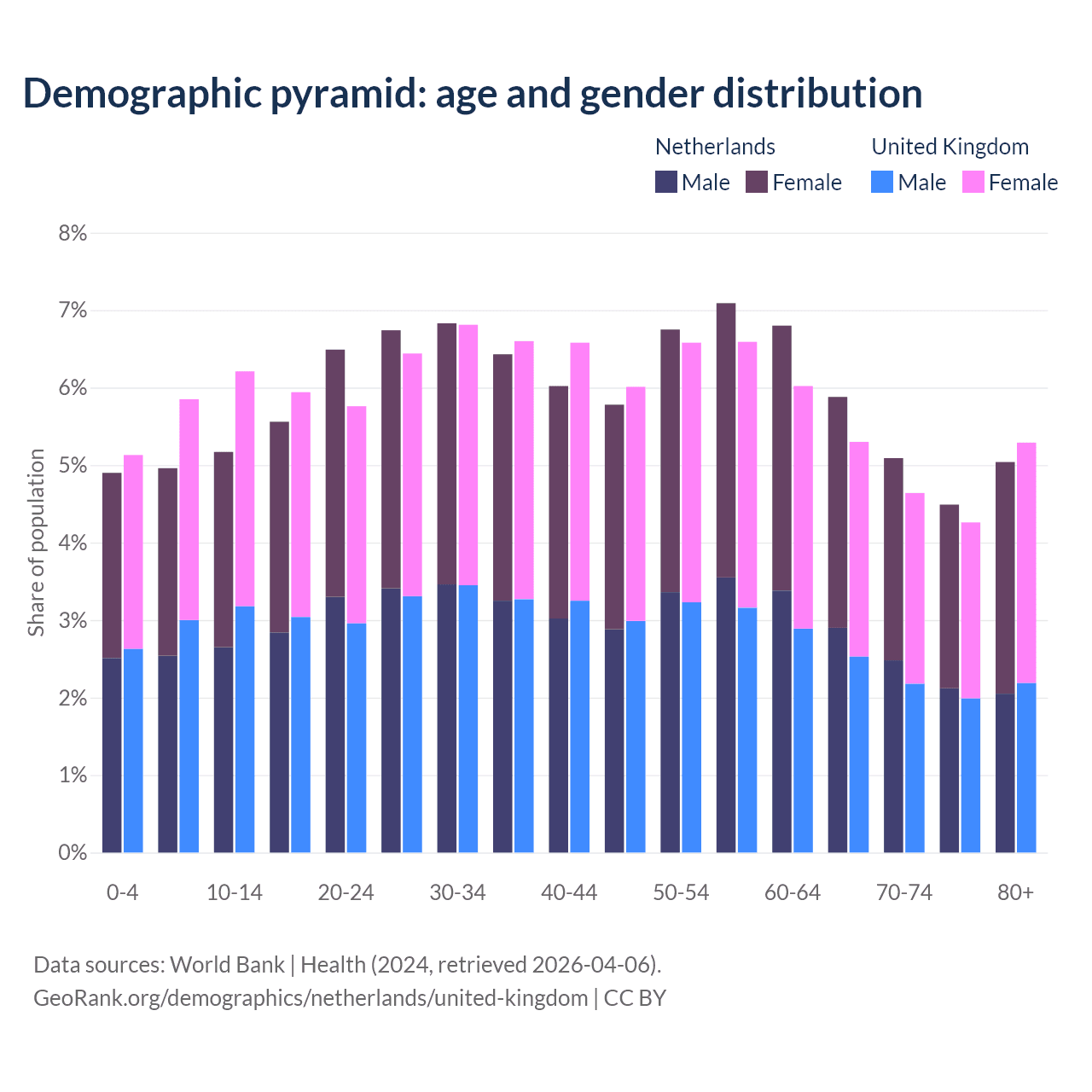 - The Netherlands is ranked 33/196 by median age (oldest to youngest) vs 41/196 for the United Kingdom.