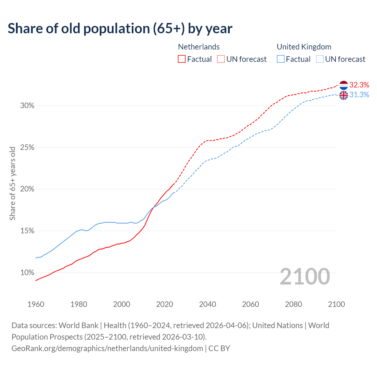 The share of older people aged 65 and over is 20.5% in the Netherlands and 19.5% in the United Kingdom. Life expectancy in the Netherlands compared to the United Kingdom .