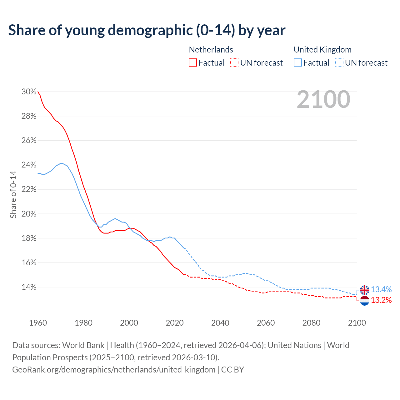 - The share of young demographic (0-15 years old) in the Netherlands is 15% vs 17.2% in the United Kingdom.