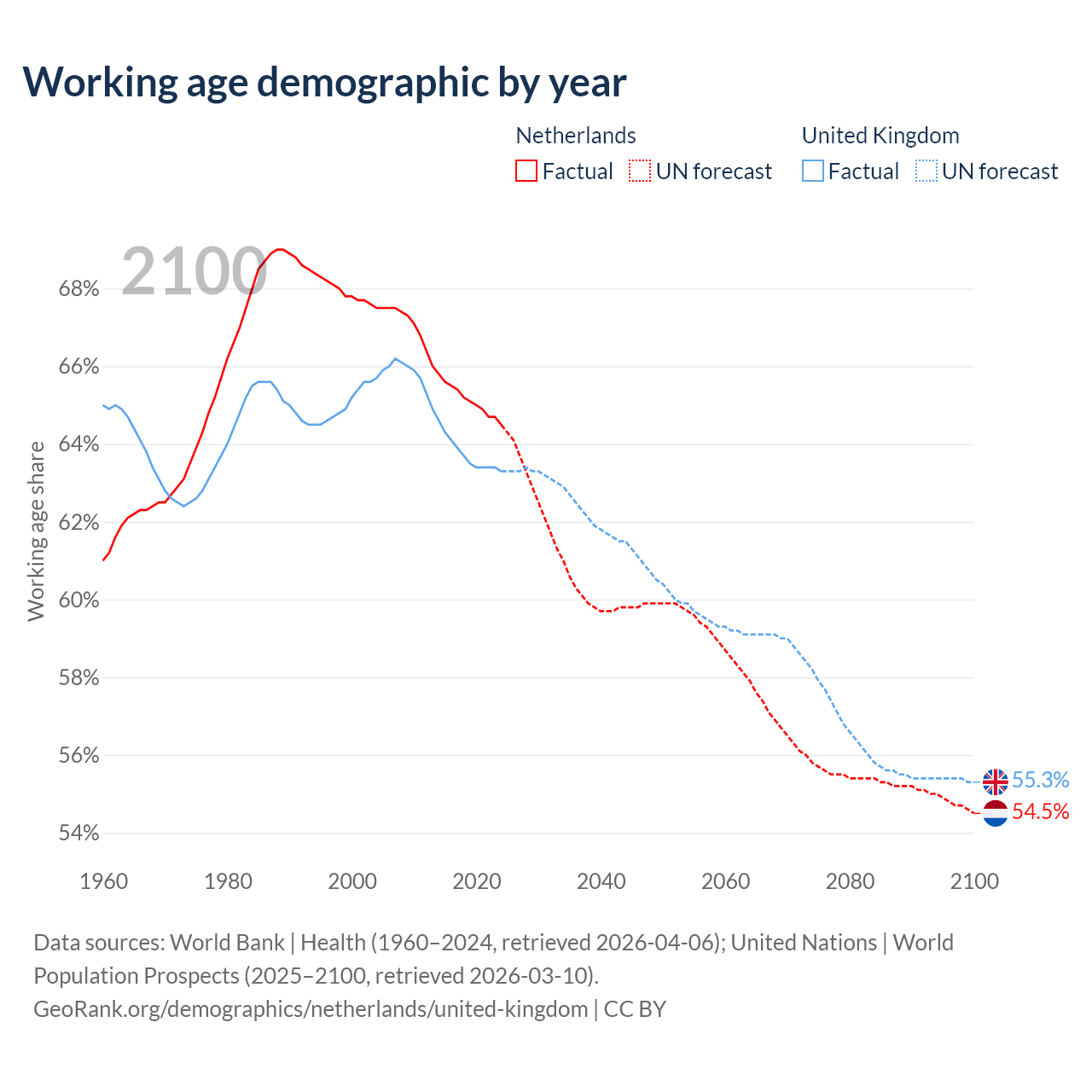 - The Netherlands has 11.8M working age adults (aged 15-64) vs 44.4M in the United Kingdom.
