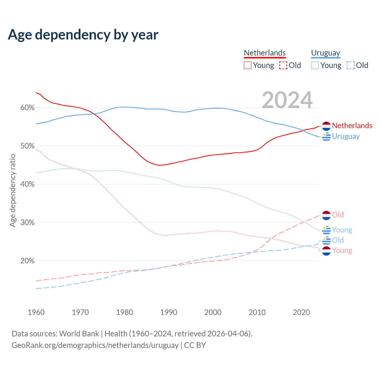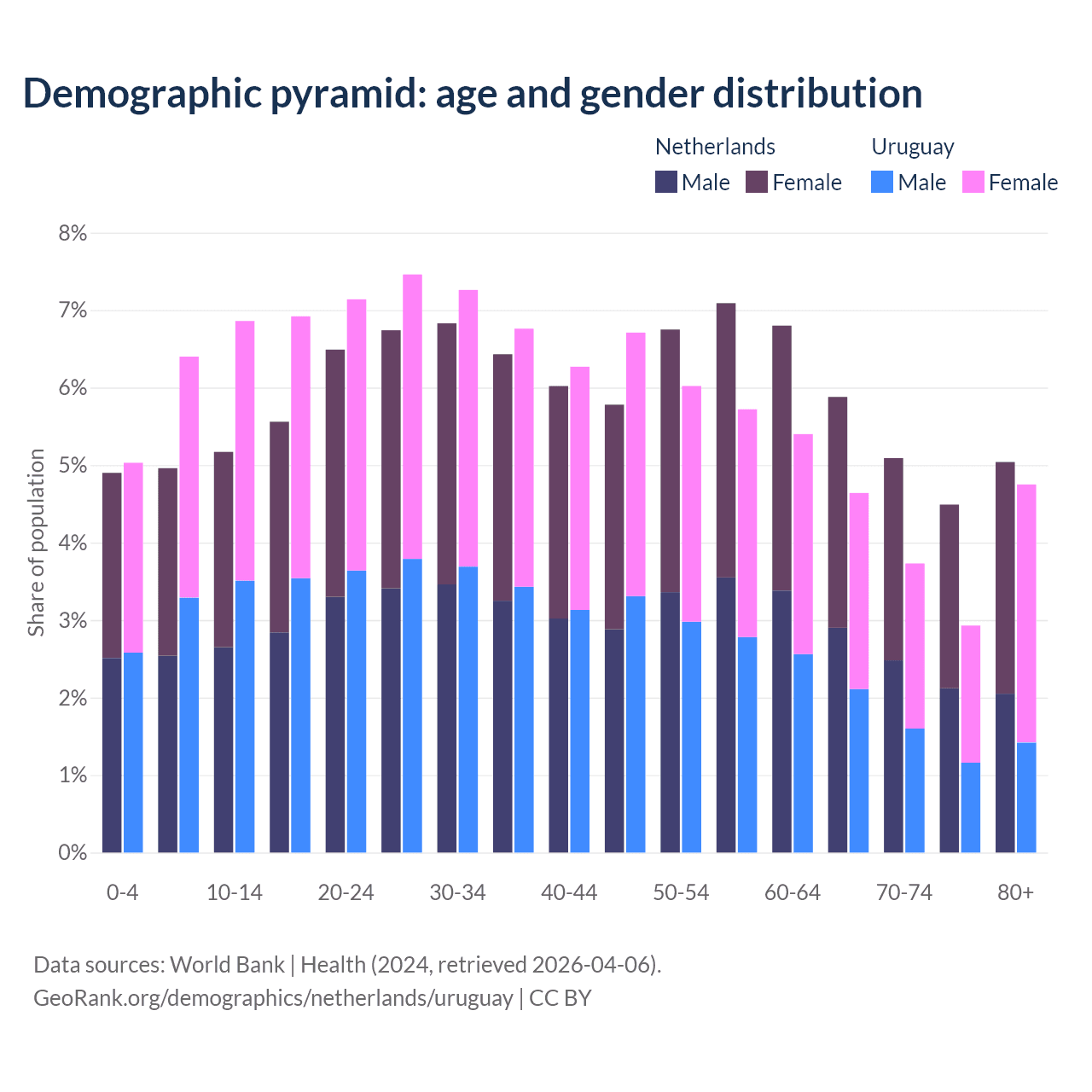 - The Netherlands is ranked 33/196 by median age (oldest to youngest) vs 63/196 for Uruguay.
