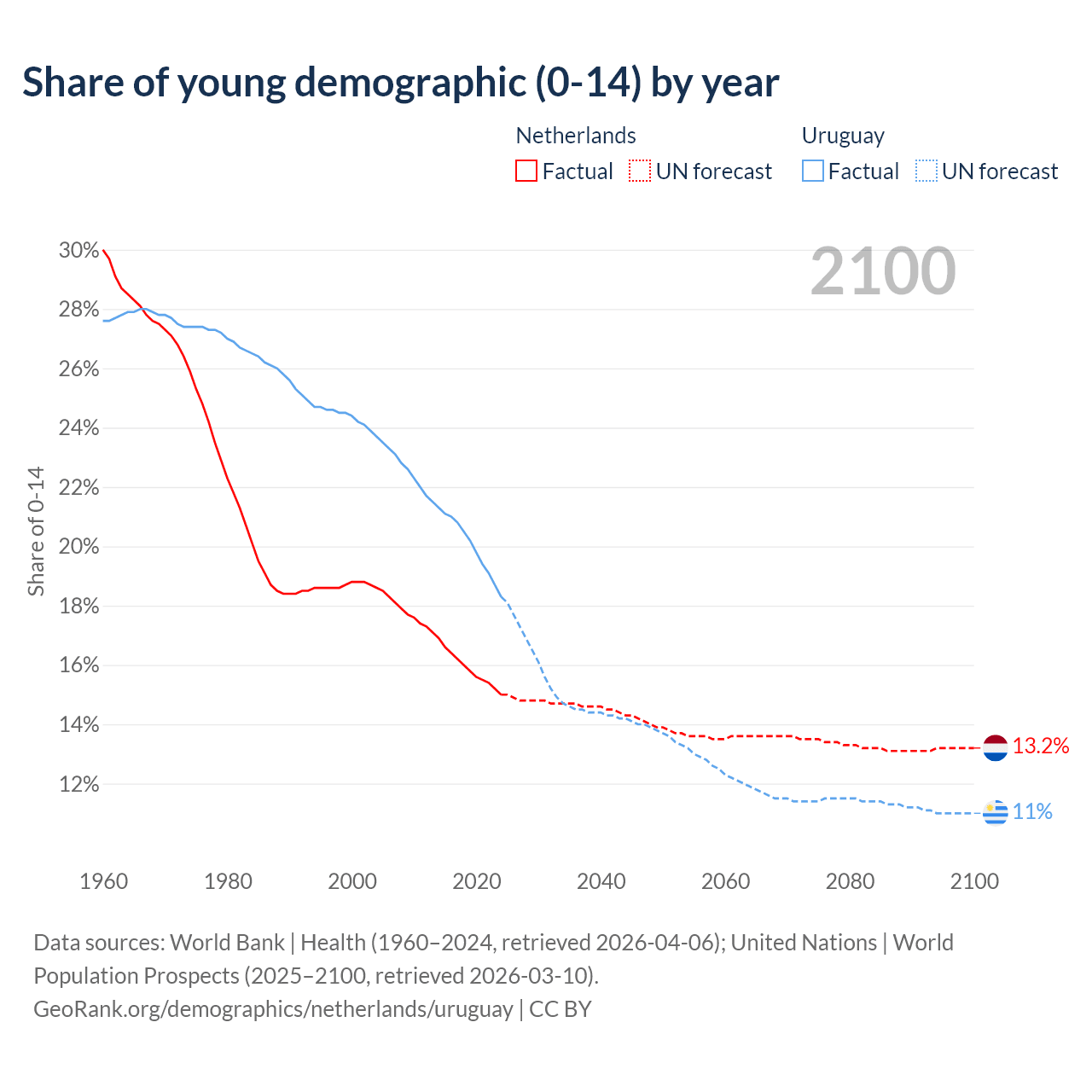 - The share of young demographic (0-15 years old) in the Netherlands is 15% vs 18.3% in Uruguay.