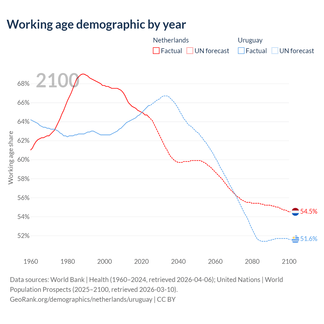 - The Netherlands has 11.8M working age adults (aged 15-64) vs 2.22M in Uruguay.