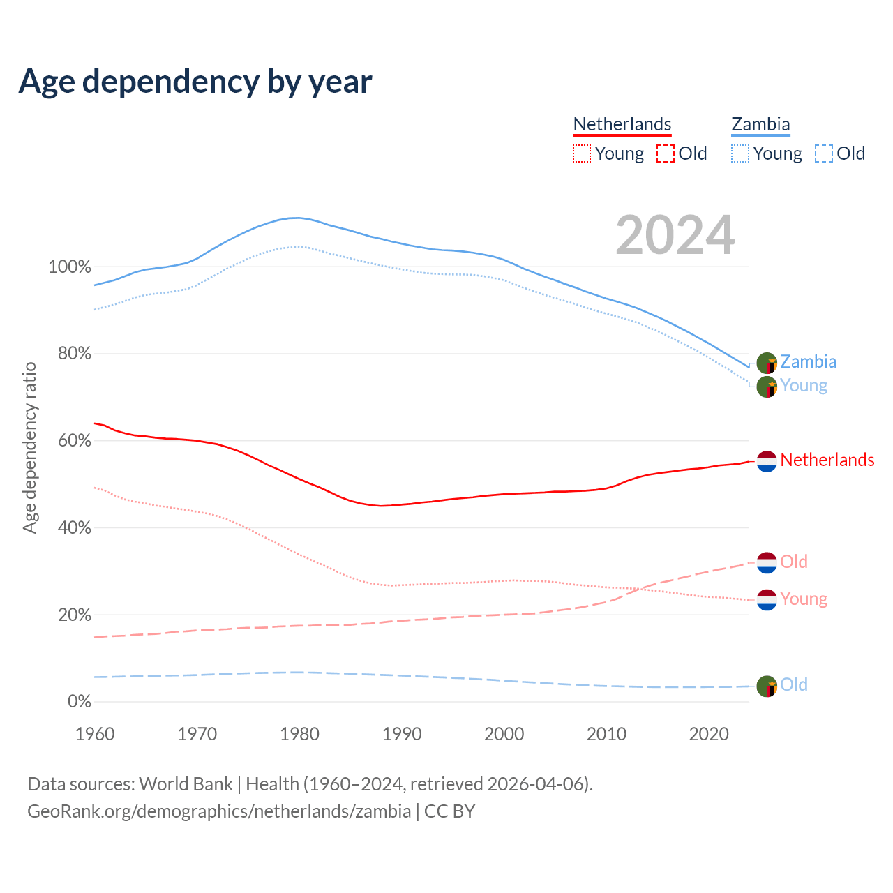 - The Netherlands is ranked 33/196 by median age (oldest to youngest) vs 182/196 for Zambia.