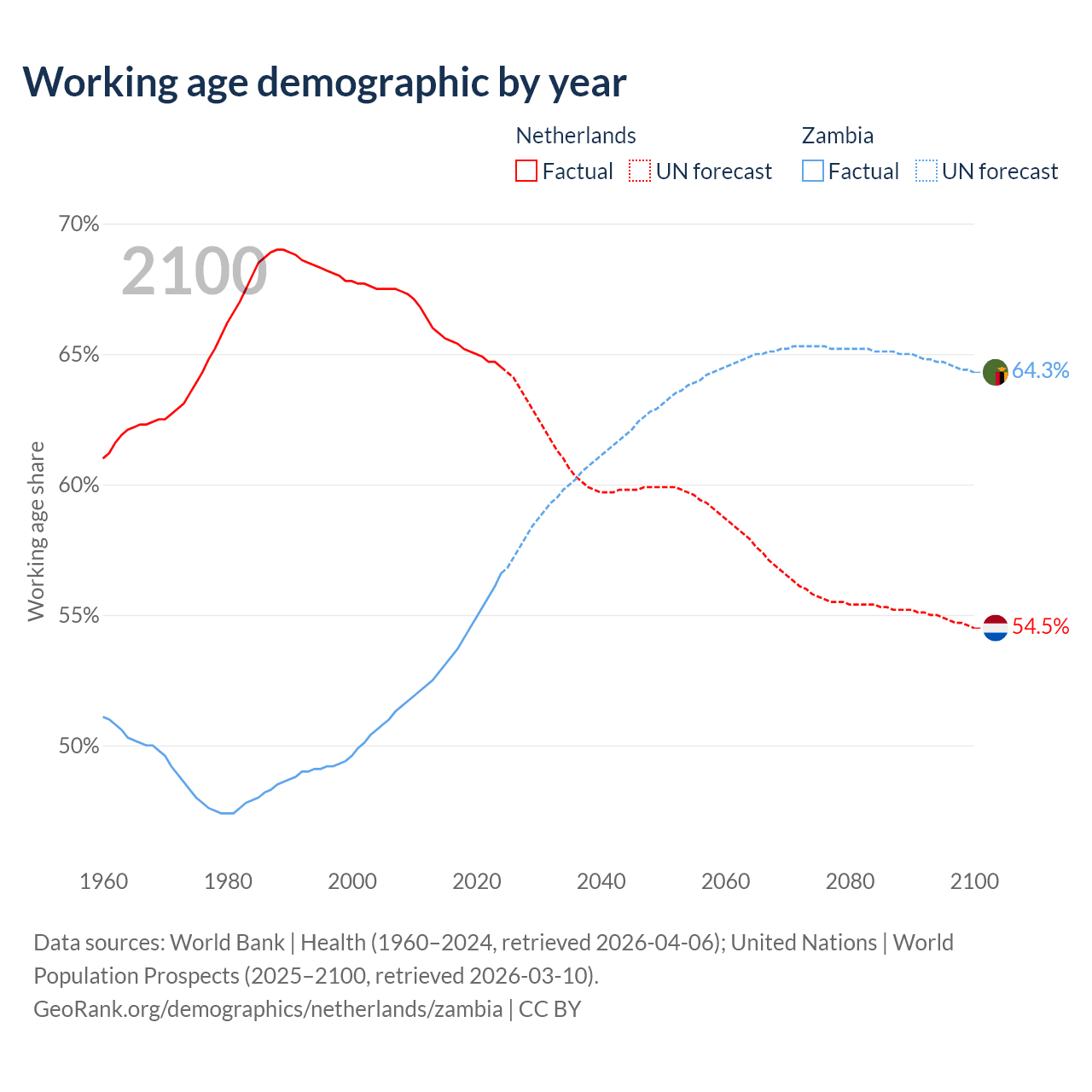 - The Netherlands has 11.8M working age adults (aged 15-64) vs 12.8M in Zambia.