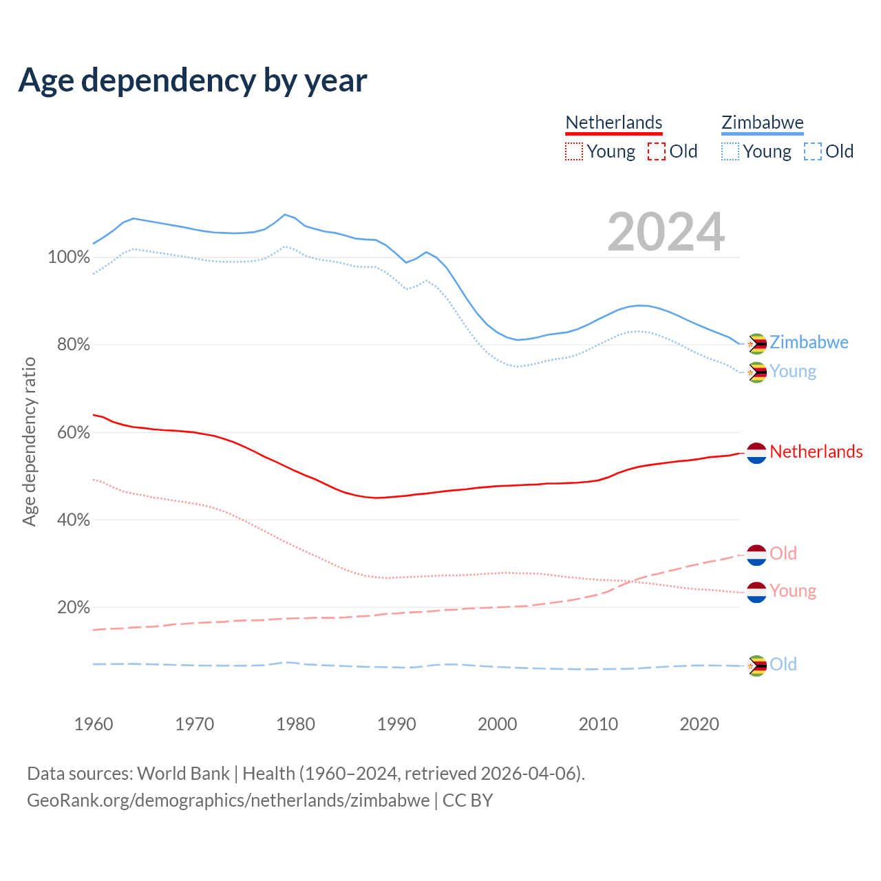 - The Netherlands is ranked 33/196 by median age (oldest to youngest) vs 177/196 for Zimbabwe.