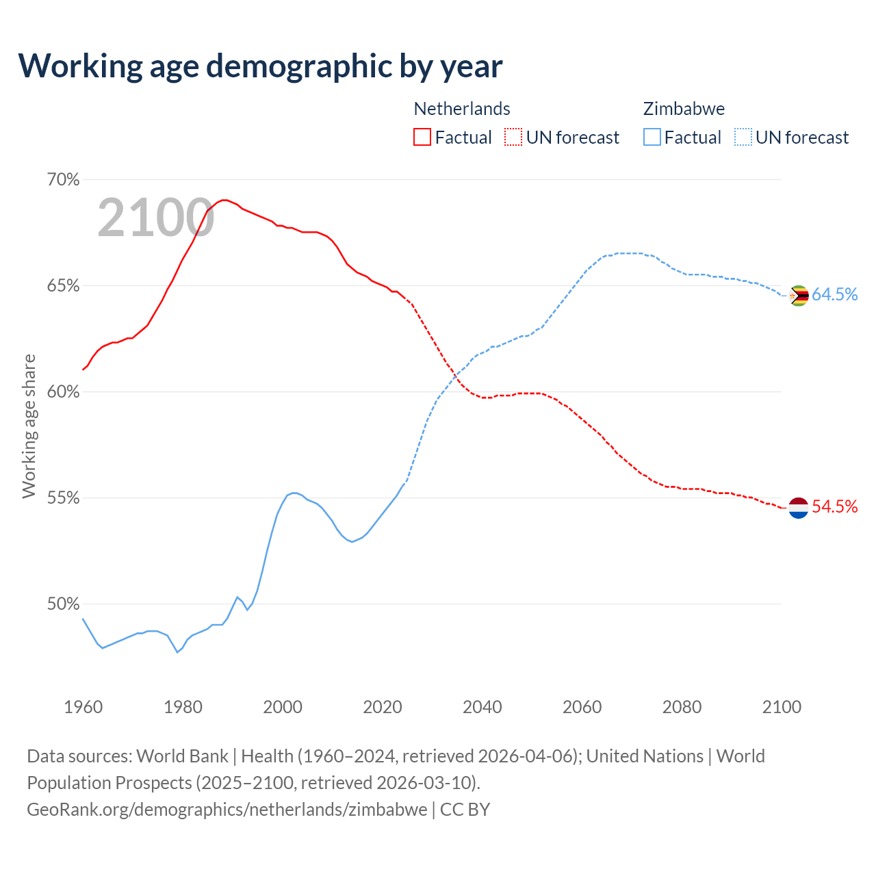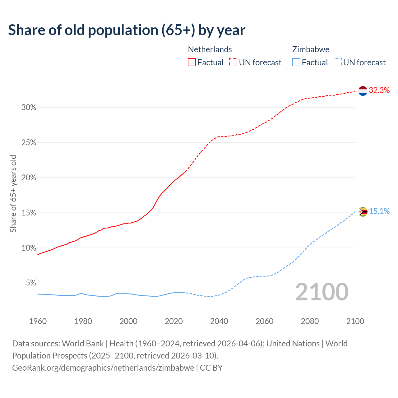 The share of older people aged 65 and over is 20.5% in the Netherlands and 3.6% in Zimbabwe. Life expectancy in the Netherlands compared to Zimbabwe .