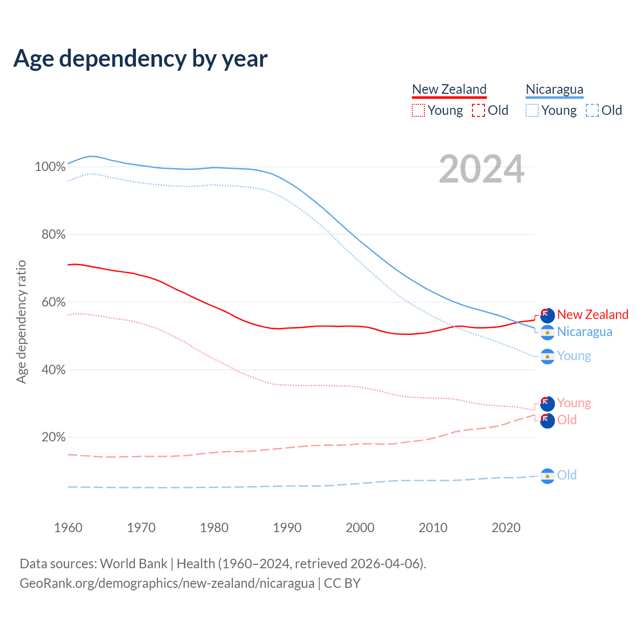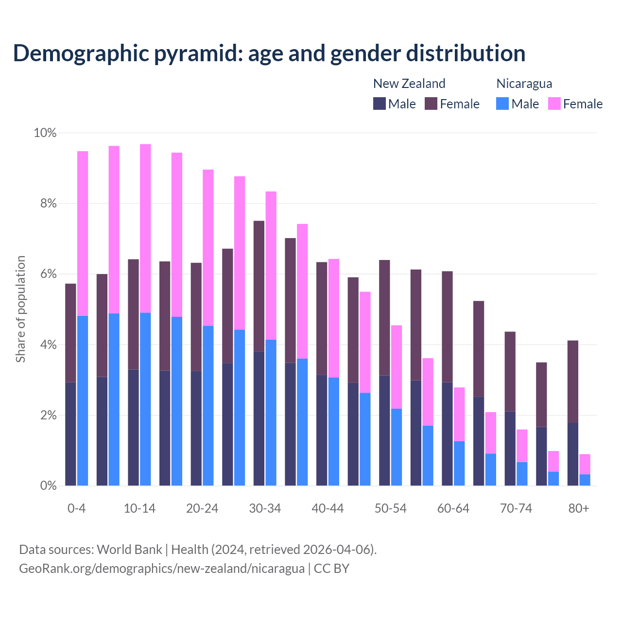 - New Zealand is ranked 56/196 by median age (oldest to youngest) vs 125/196 for Nicaragua.