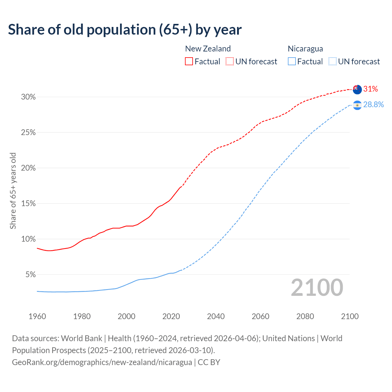 The share of older people aged 65 and over is 17.2% in New Zealand and 5.53% in Nicaragua. Life expectancy in New Zealand compared to Nicaragua .