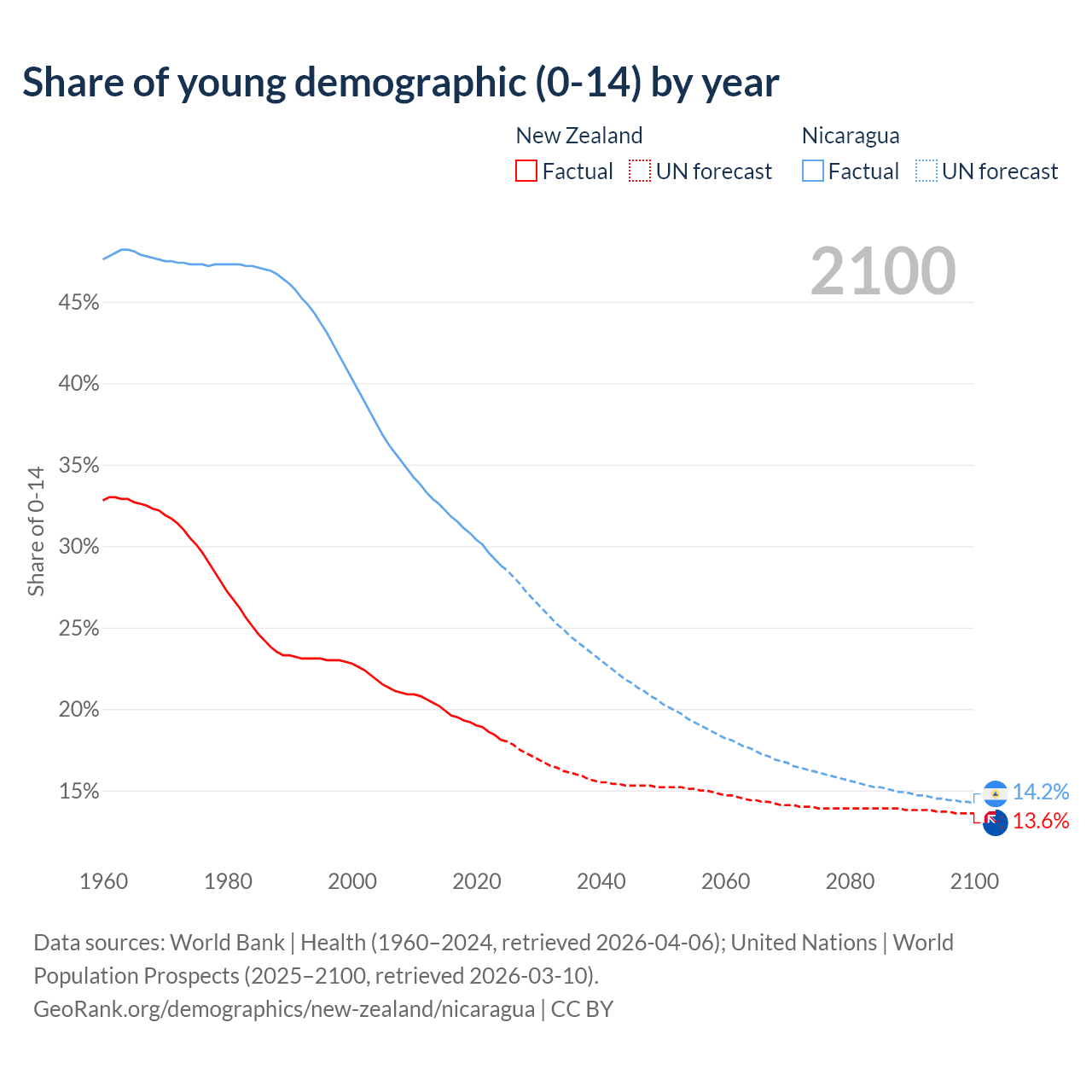 - The share of young demographic (0-15 years old) in New Zealand is 18.1% vs 28.8% in Nicaragua.