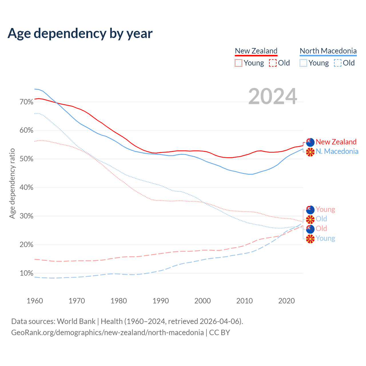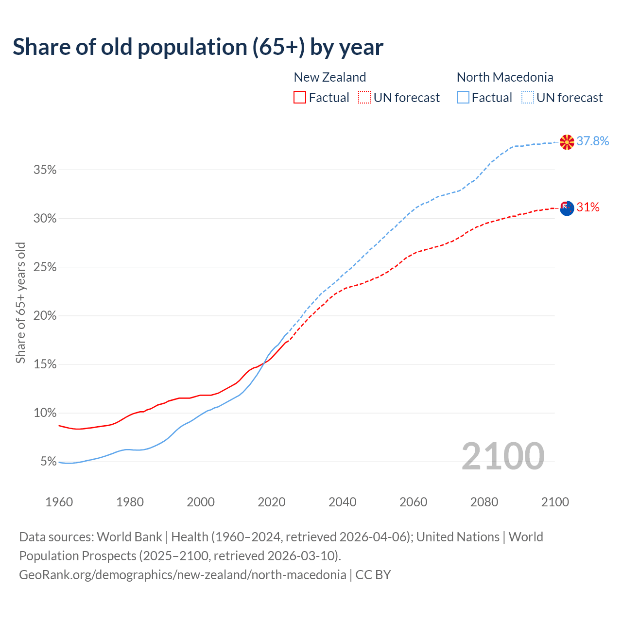 The share of older people aged 65 and over is 17.2% in New Zealand and 18% in North Macedonia. Life expectancy in New Zealand compared to North Macedonia .
