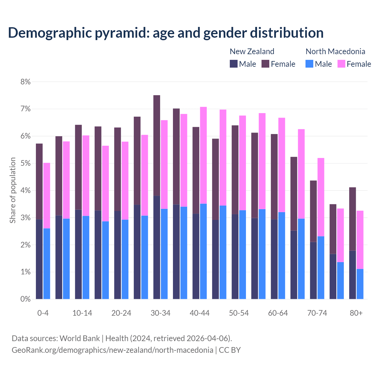 - New Zealand is ranked 56/196 by median age (oldest to youngest) vs 37/196 for North Macedonia.