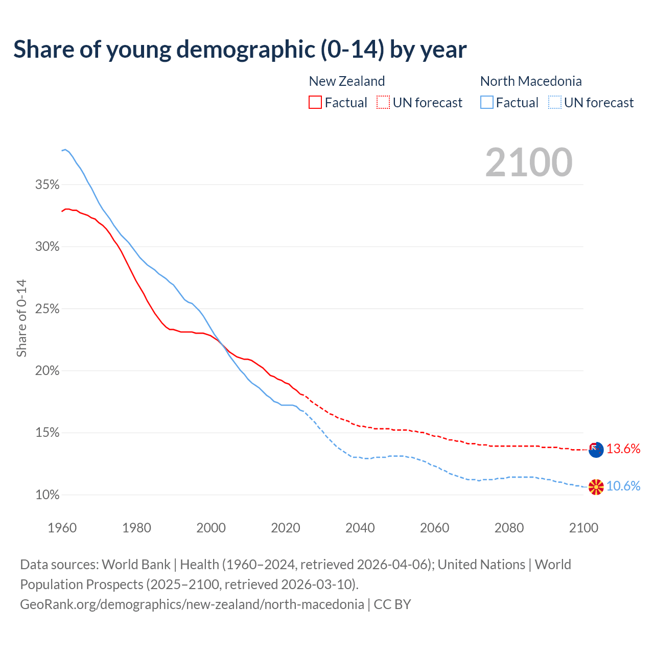 - The share of young demographic (0-15 years old) in New Zealand is 18.1% vs 16.8% in North Macedonia.
