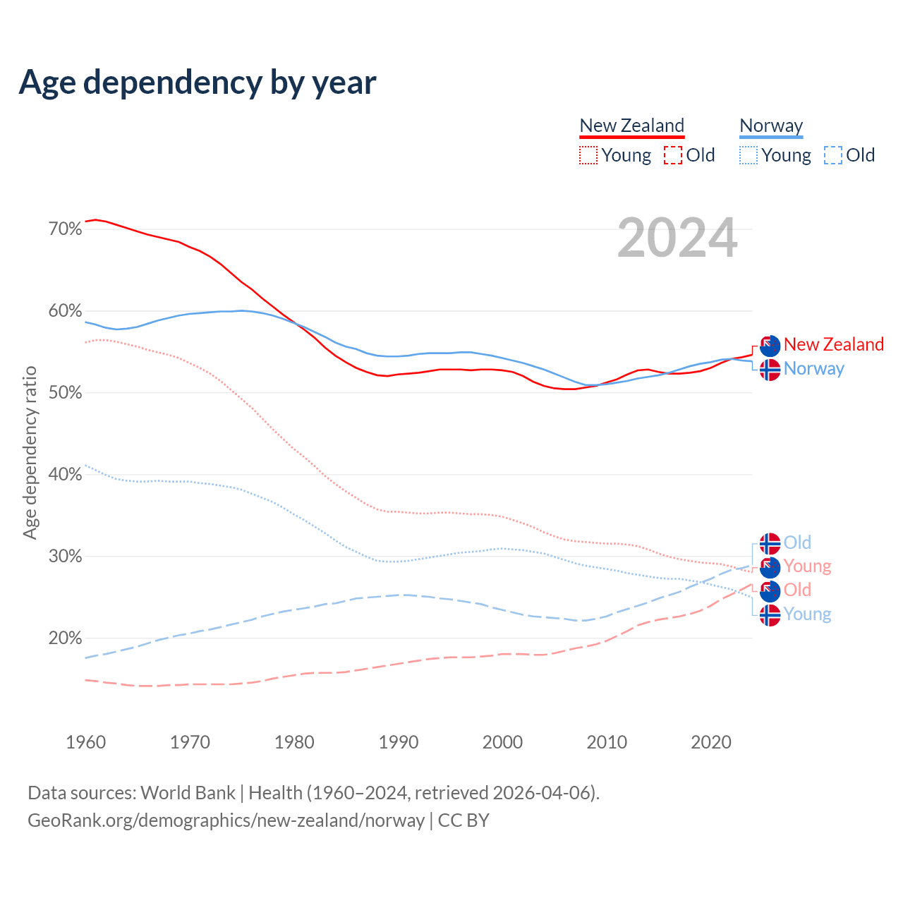 - New Zealand is ranked 56/196 by median age (oldest to youngest) vs 43/196 for Norway.
