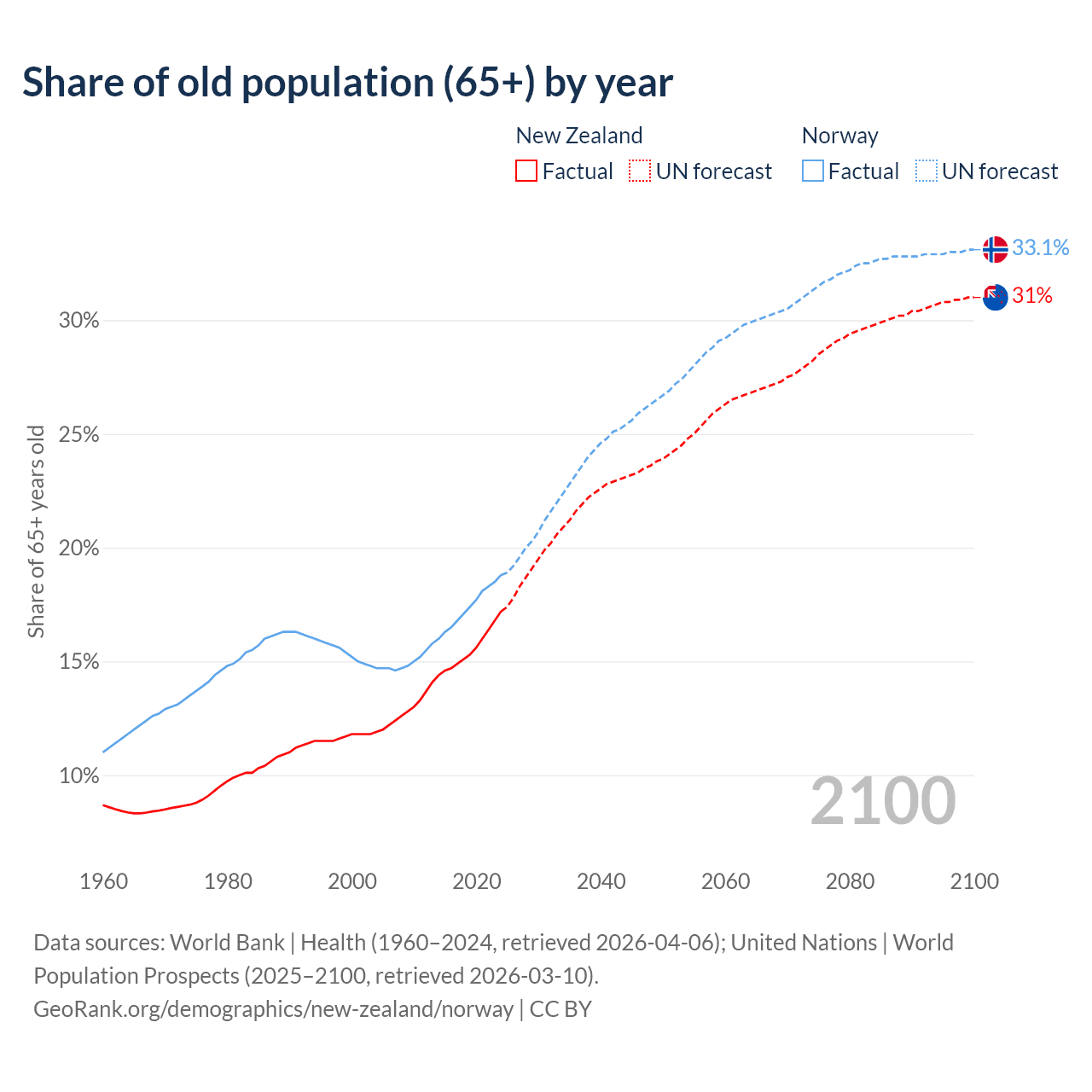 The share of older people aged 65 and over is 17.2% in New Zealand and 18.8% in Norway. Life expectancy in New Zealand compared to Norway .
