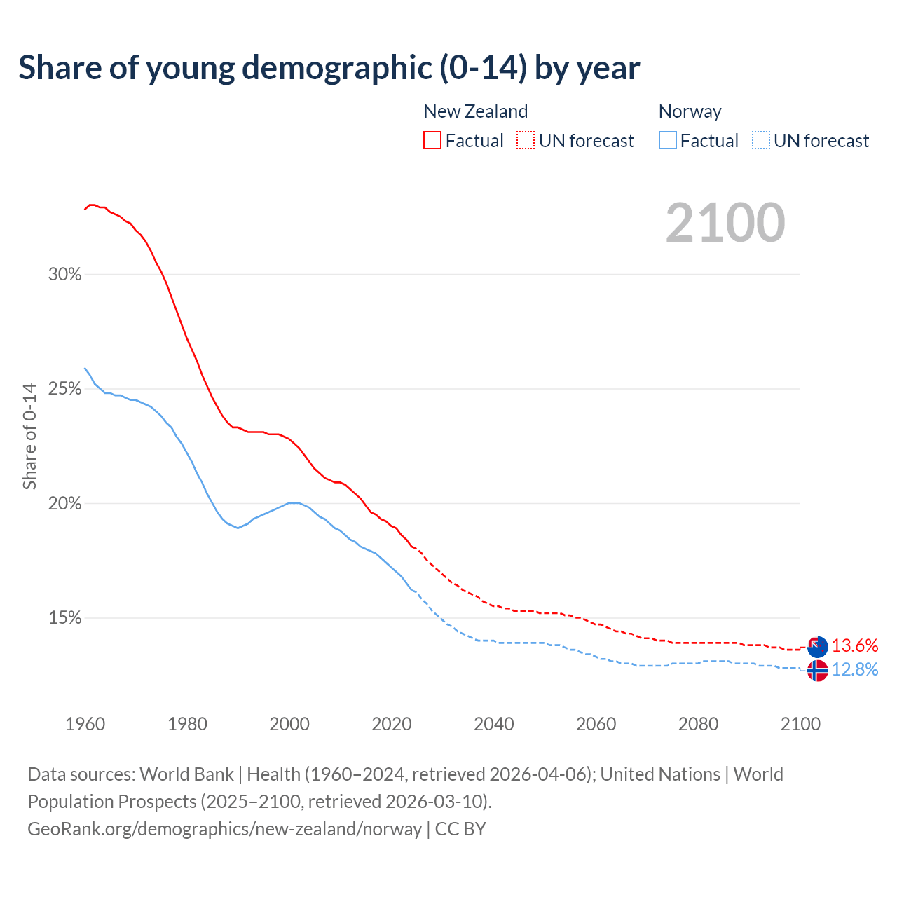 - The share of young demographic (0-15 years old) in New Zealand is 18.1% vs 16.2% in Norway.