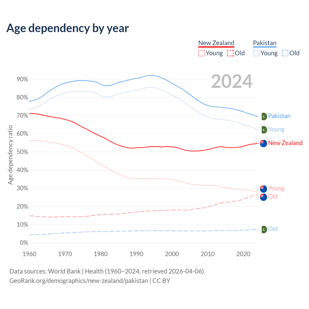- New Zealand is ranked 56/196 by median age (oldest to youngest) vs 154/196 for Pakistan.