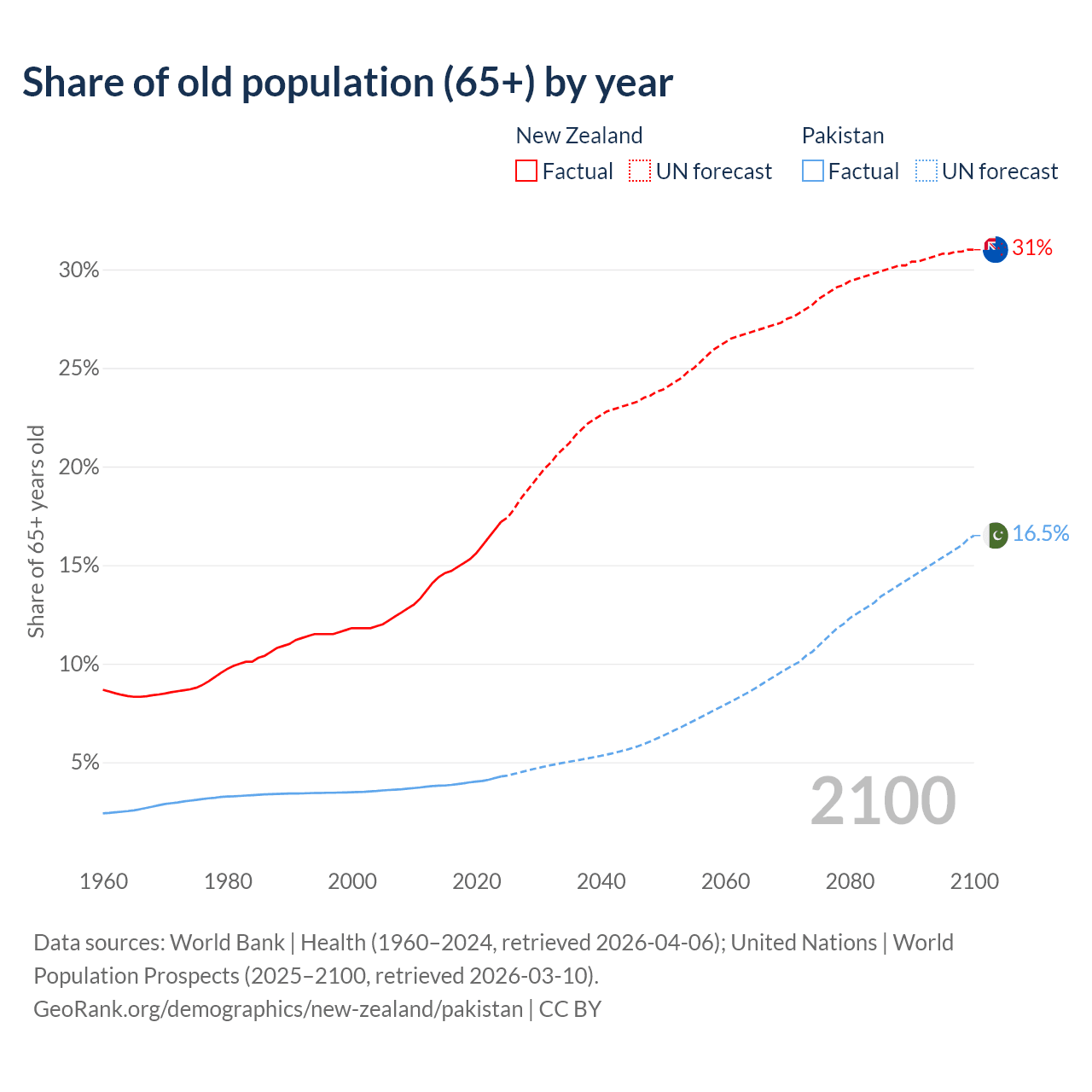 - The share of old-age demographic (65+) in New Zealand is 17.2% vs 4.28% in Pakistan.