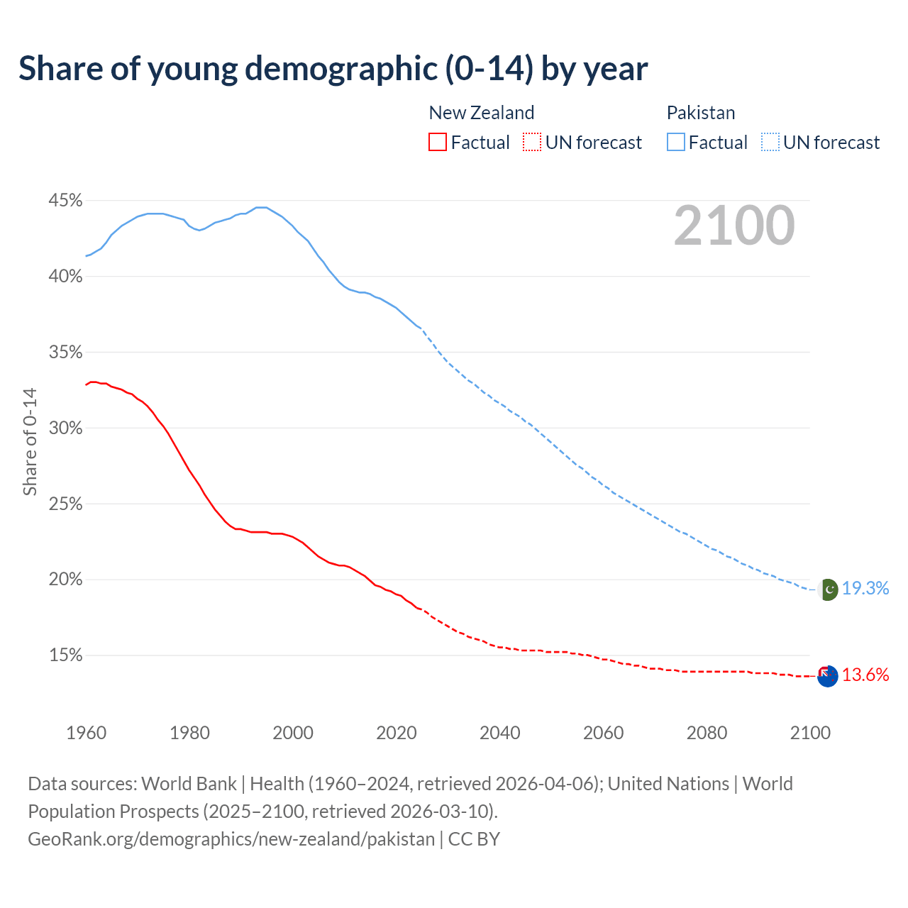 - The share of young demographic (0-15 years old) in New Zealand is 18.1% vs 36.7% in Pakistan.