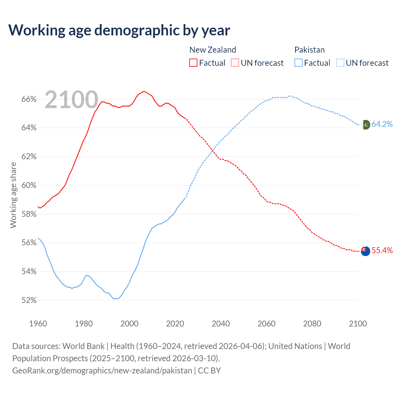 - New Zealand has 3.48M working age adults (aged 15-64) vs 154M in Pakistan.
