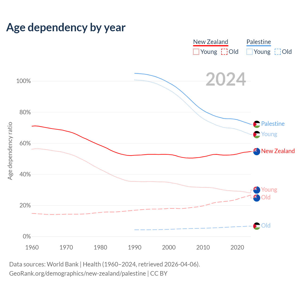 - New Zealand is ranked 56/196 by median age (oldest to youngest) vs 157/196 for Palestine.