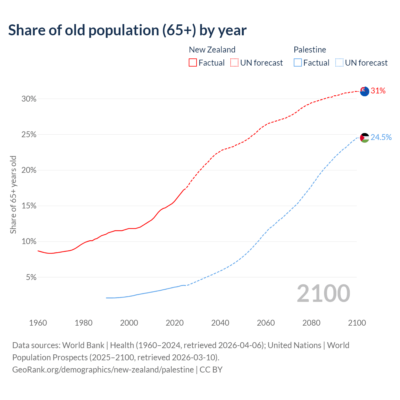 - The share of old-age demographic (65+) in New Zealand is 17.2% vs 3.84% in Palestine.