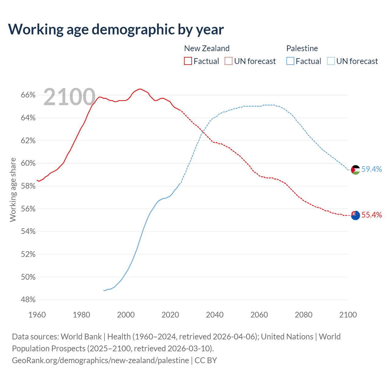 - New Zealand has 3.48M working age adults (aged 15-64) vs 3.2M in Palestine.