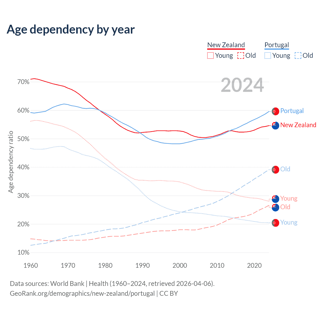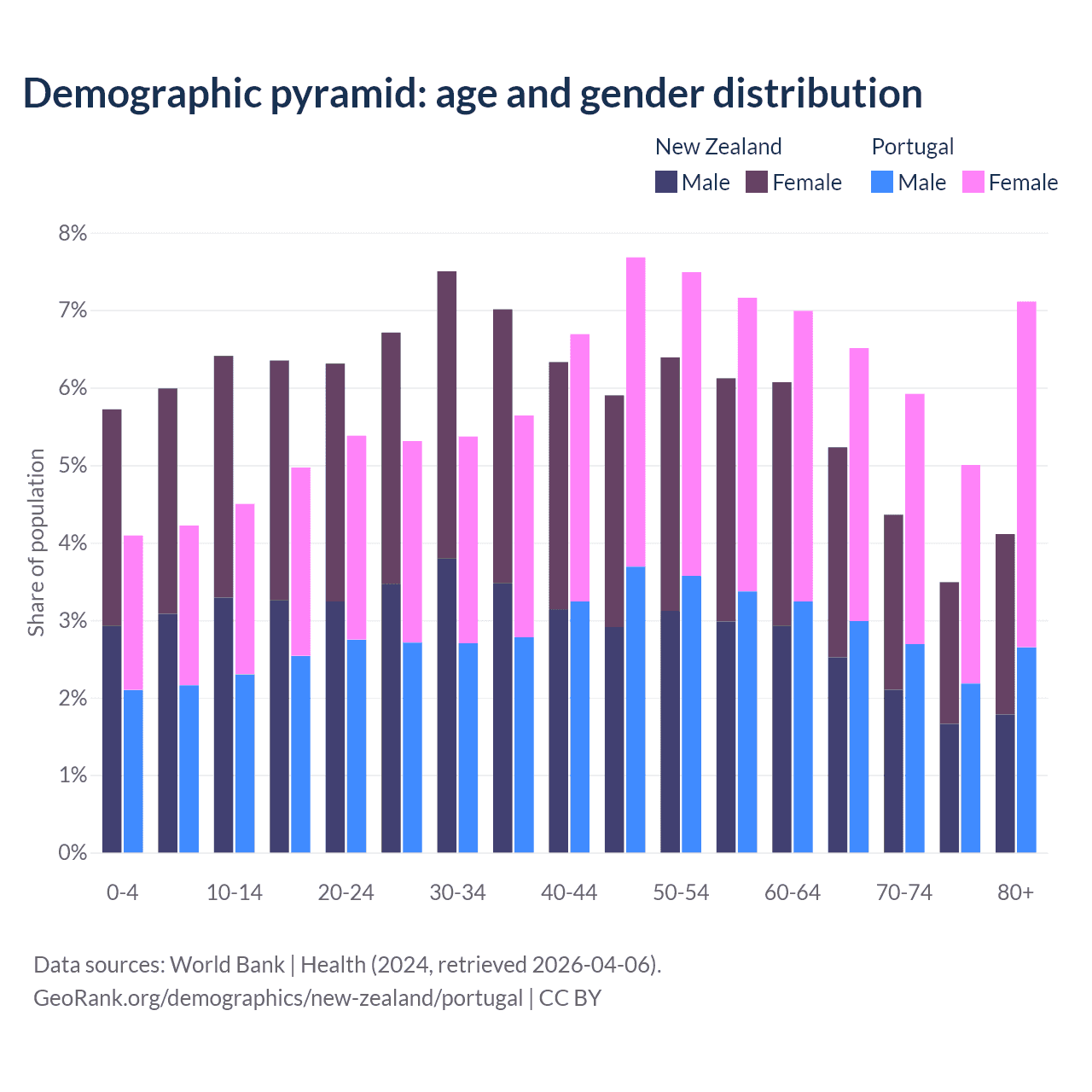 - New Zealand is ranked 56/196 by median age (oldest to youngest) vs 5/196 for Portugal.