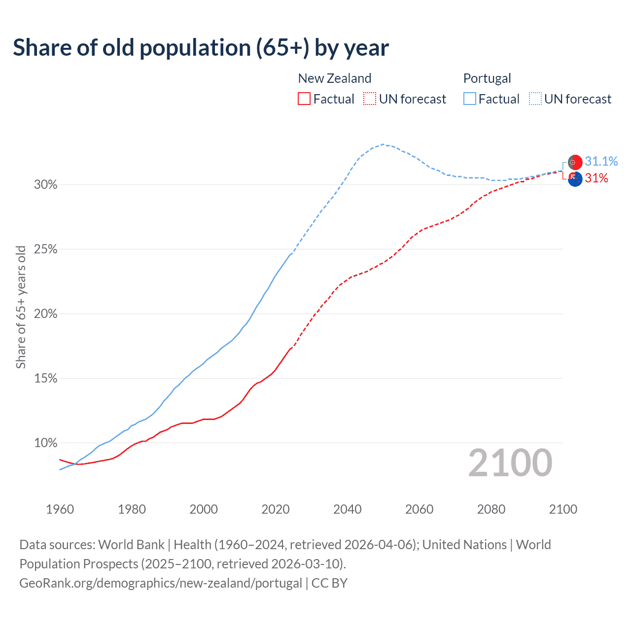 - The share of old-age demographic (65+) in New Zealand is 17.2% vs 24.5% in Portugal.