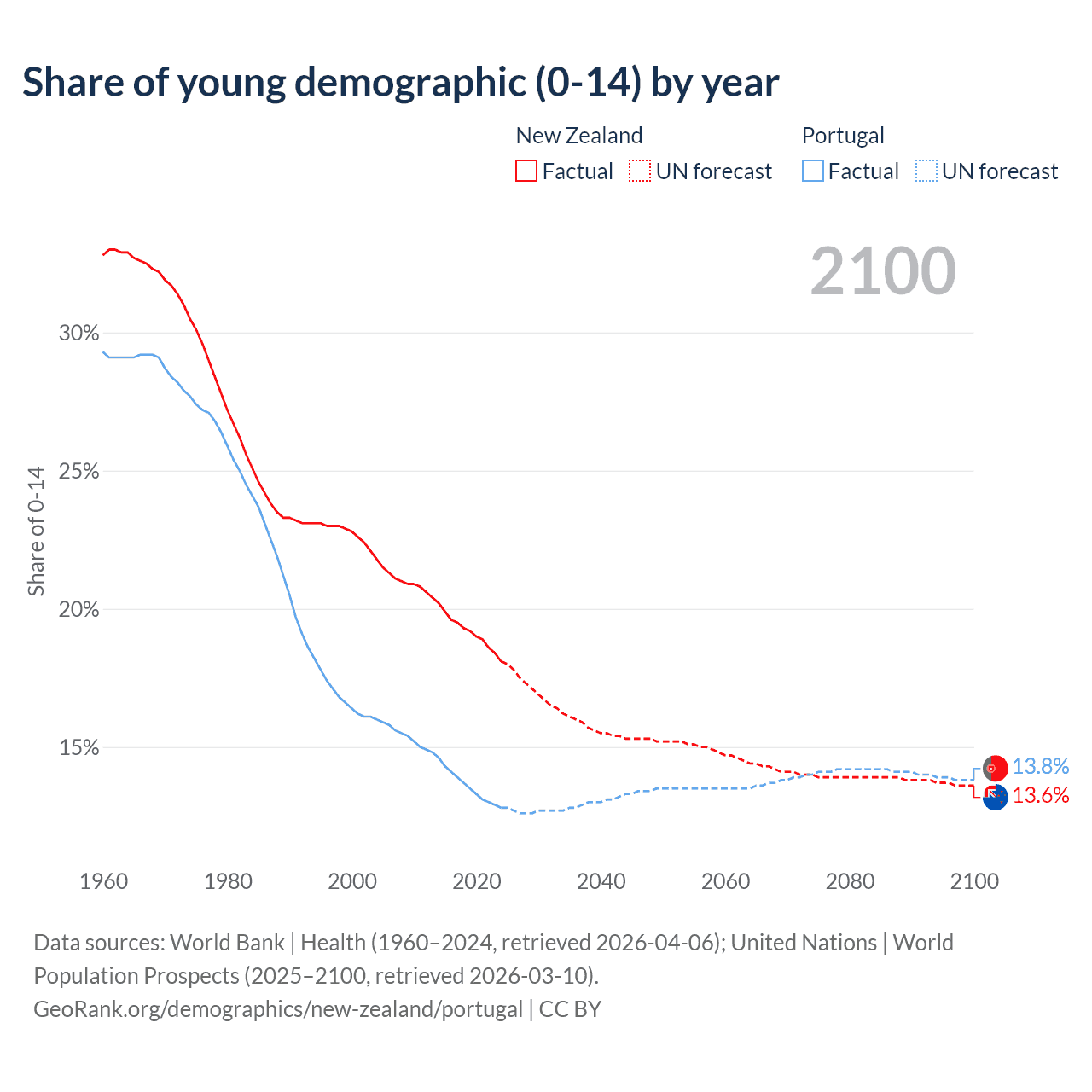 - The share of young demographic (0-15 years old) in New Zealand is 18.1% vs 12.8% in Portugal.