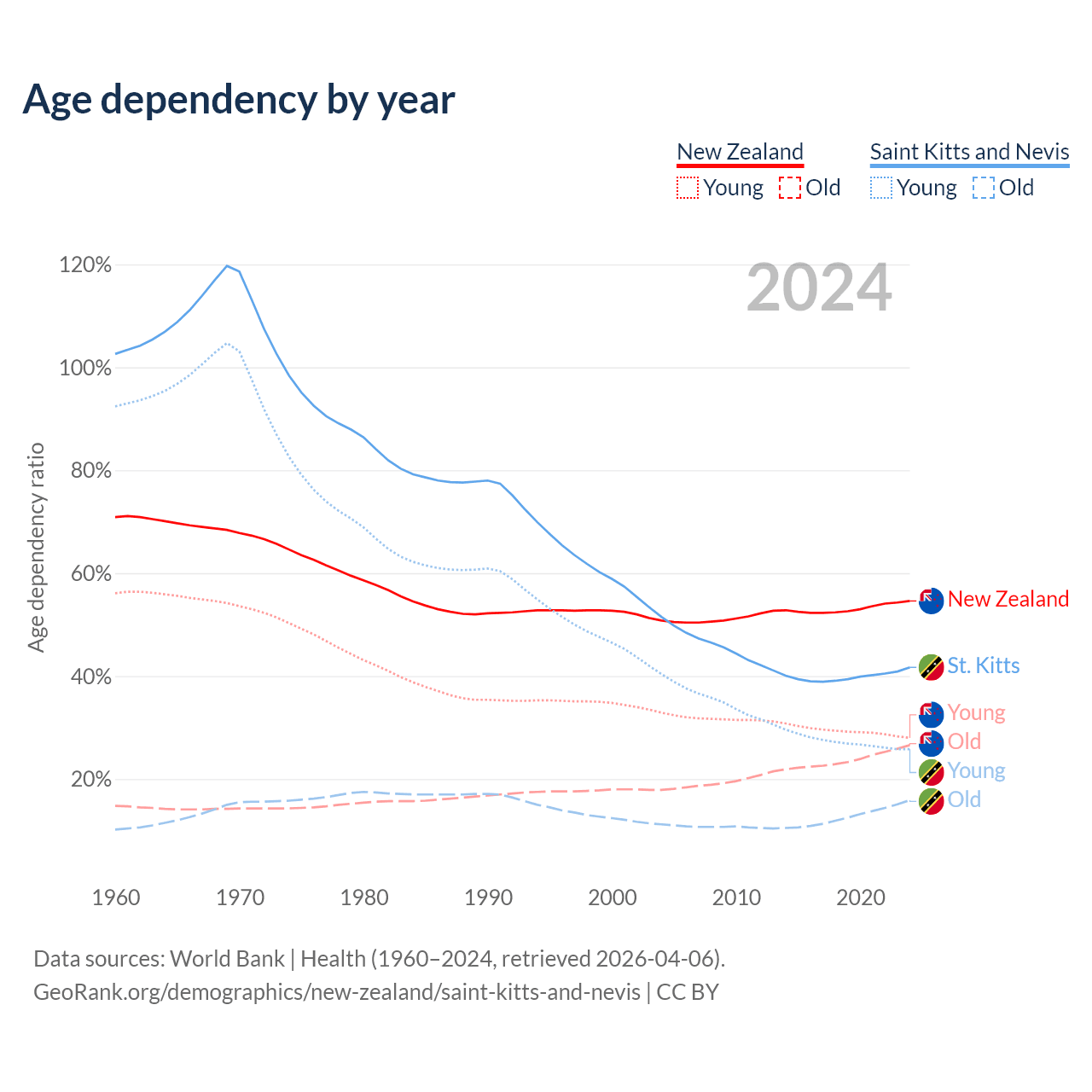 - The share of old-age demographic (65+) in New Zealand is 17.2% vs 11.2% in Saint Kitts and Nevis.