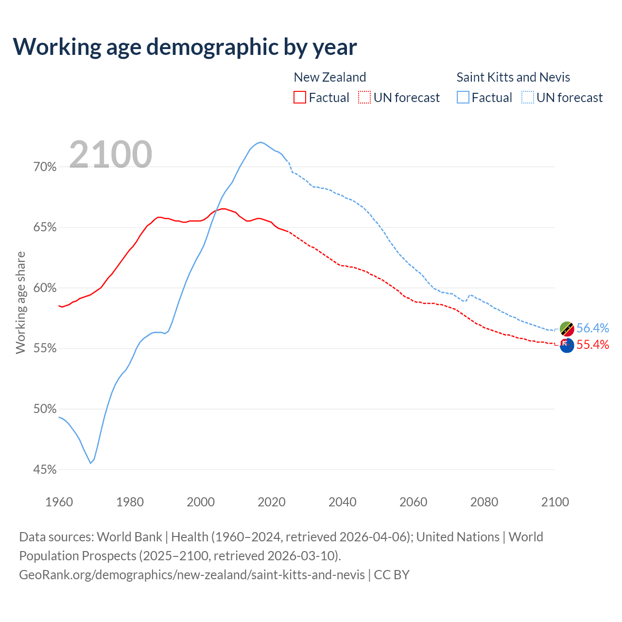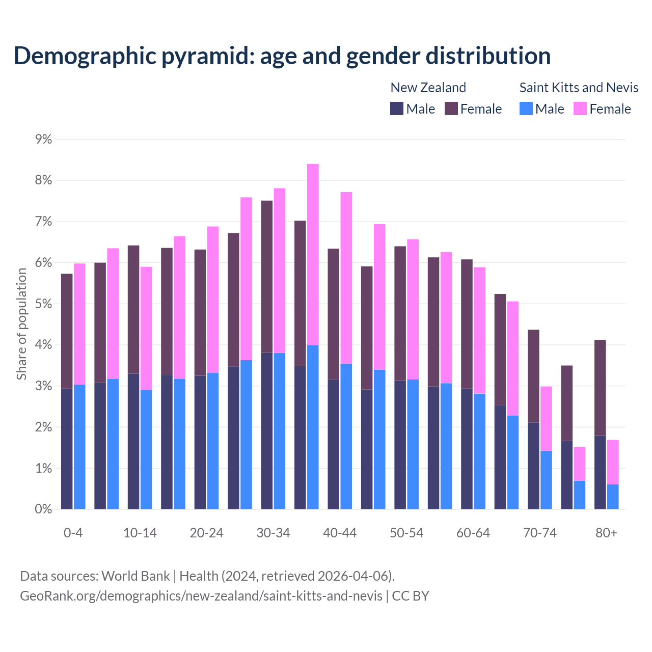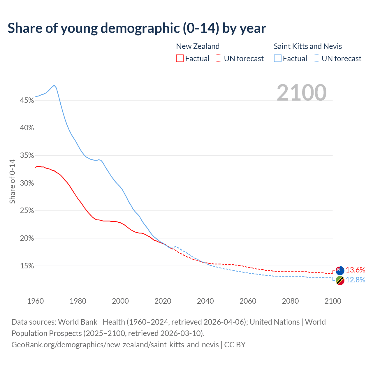 - The share of young demographic (0-15 years old) in New Zealand is 18.1% vs 18.2% in Saint Kitts and Nevis.
