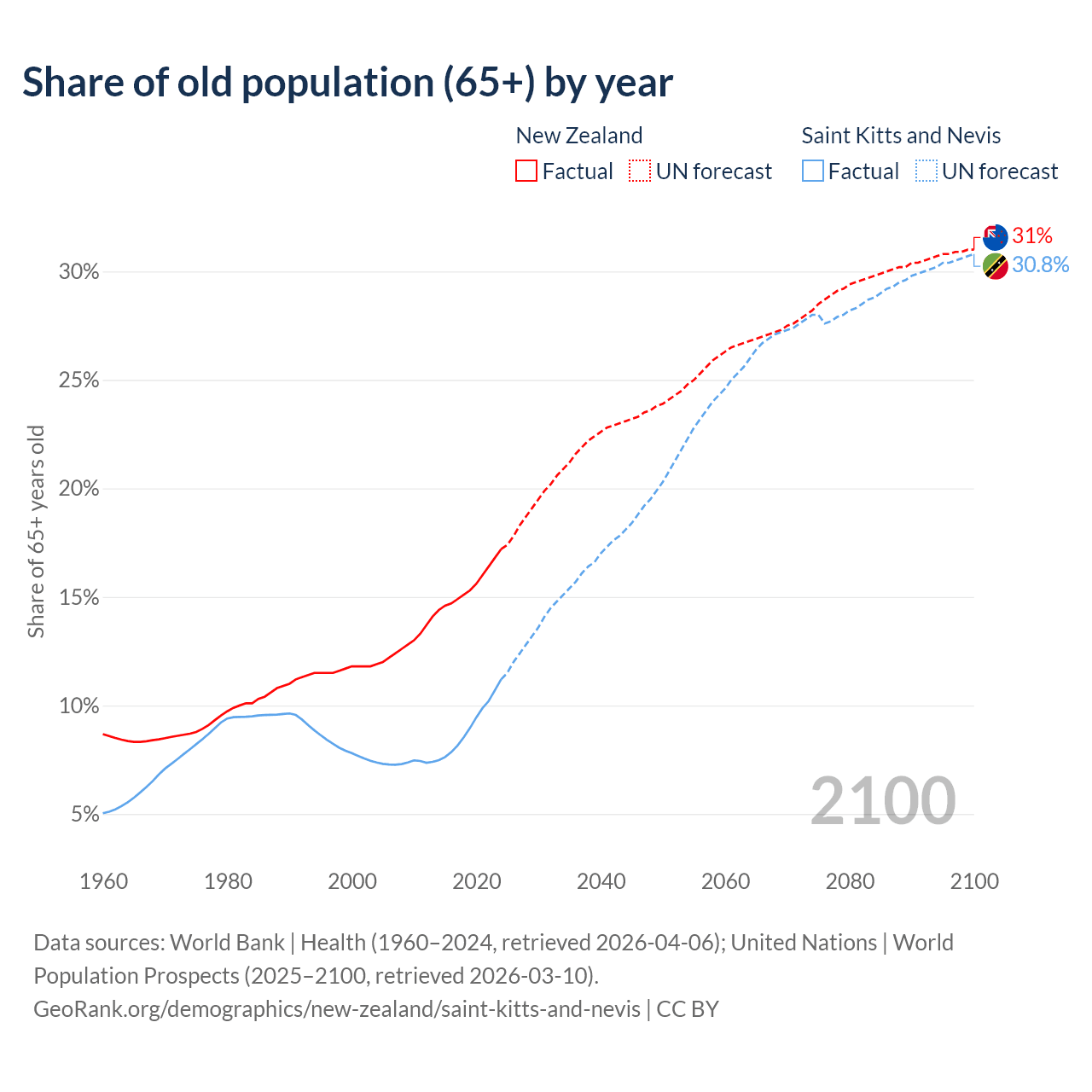 The share of older people aged 65 and over is 17.2% in New Zealand and 11.2% in Saint Kitts and Nevis. Life expectancy in New Zealand compared to Saint Kitts and Nevis .