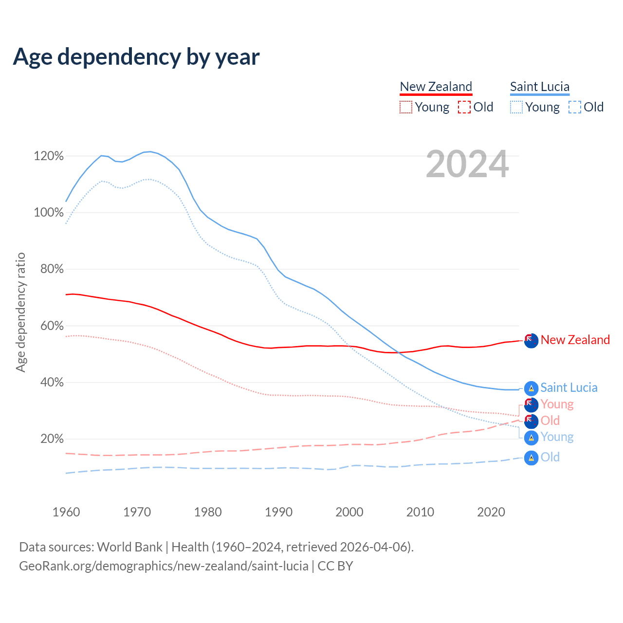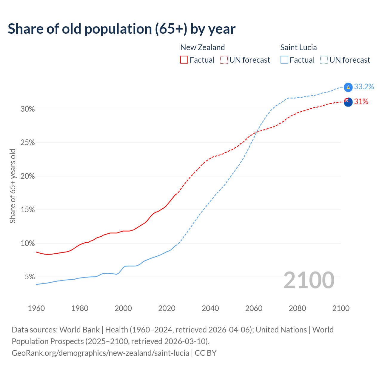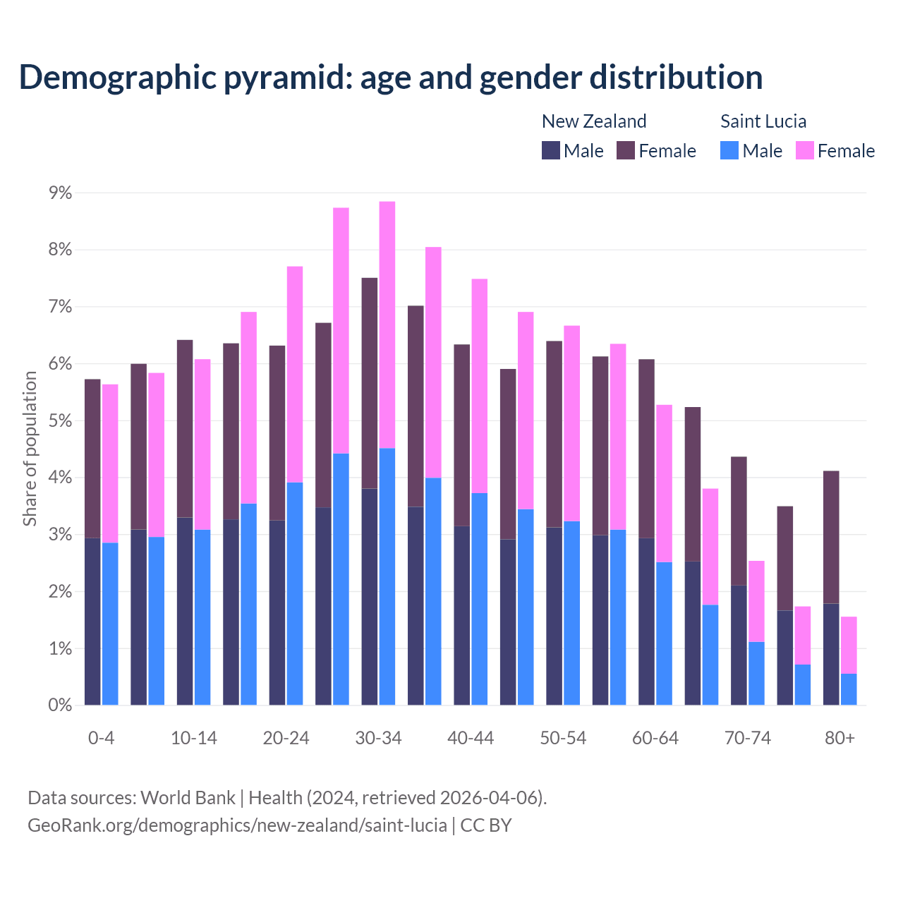 - The share of old-age demographic (65+) in New Zealand is 17.2% vs 9.62% in Saint Lucia.