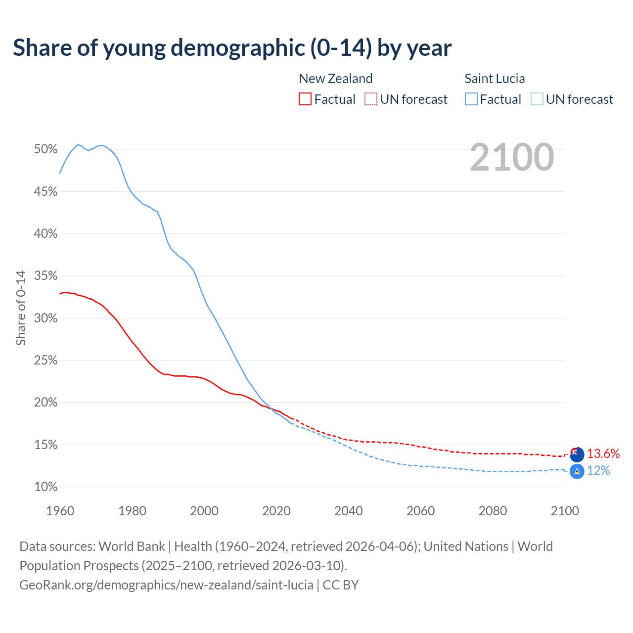 - The share of young demographic (0-15 years old) in New Zealand is 18.1% vs 17.5% in Saint Lucia.