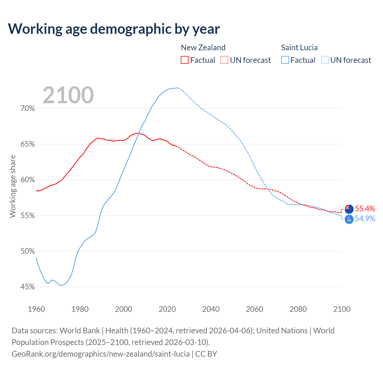 - New Zealand has 3.48M working age adults (aged 15-64) vs 132K in Saint Lucia.