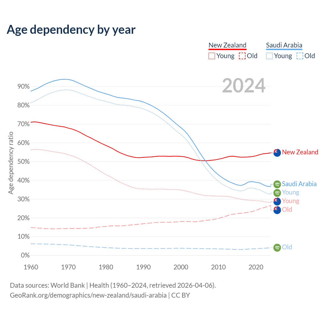 - New Zealand is ranked 56/196 by median age (oldest to youngest) vs 98/196 for Saudi Arabia.