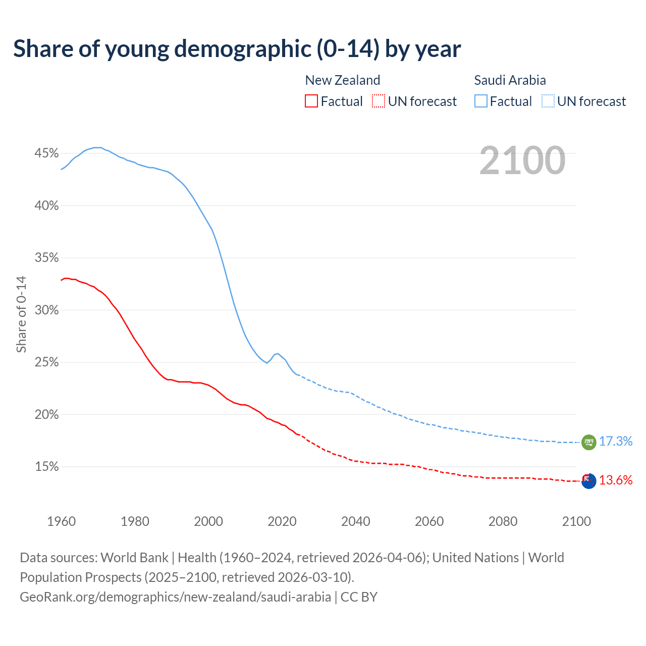 - The share of young demographic (0-15 years old) in New Zealand is 18.1% vs 23.8% in Saudi Arabia.