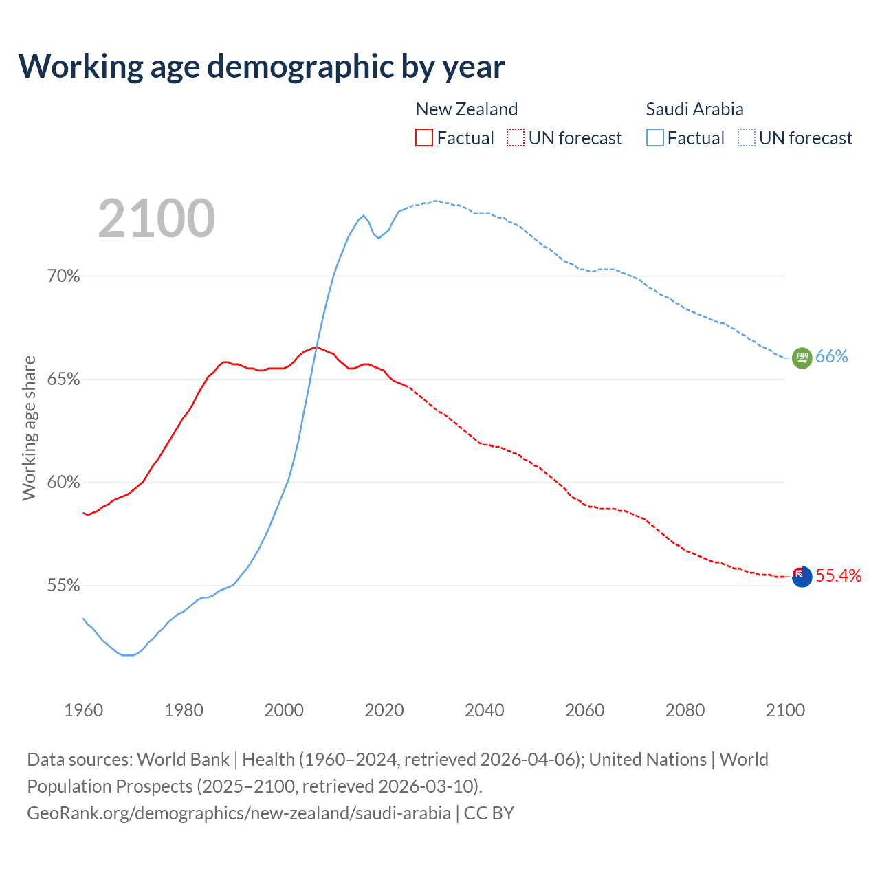 Median age New Zealand vs Saudi Arabia, 1960-2100