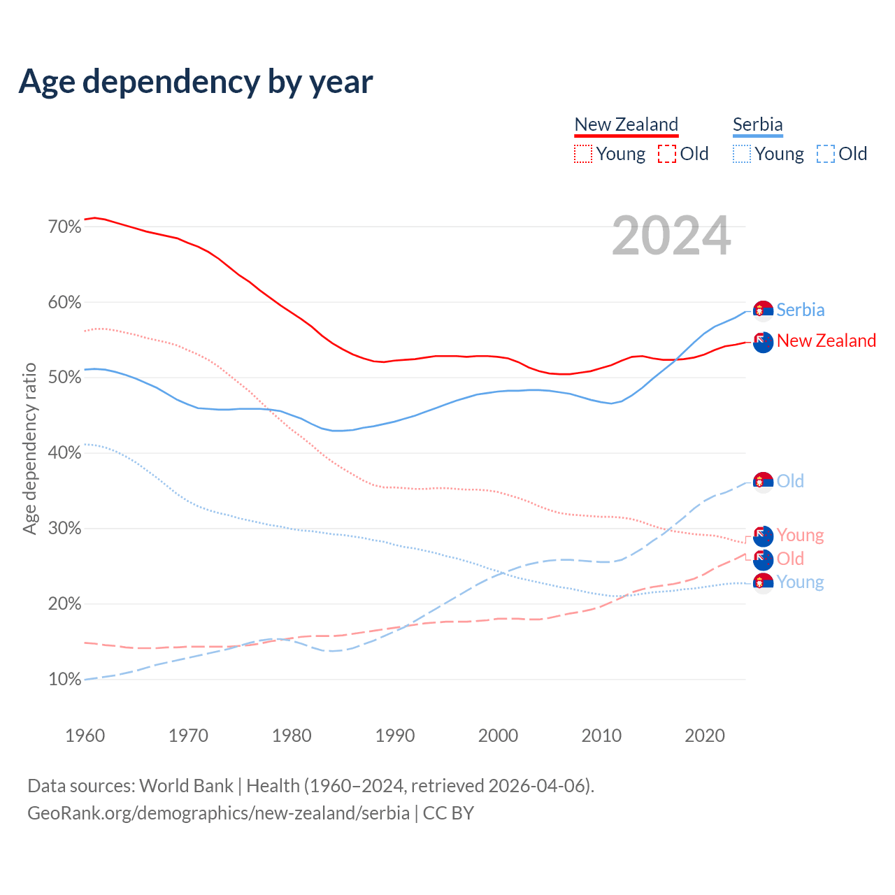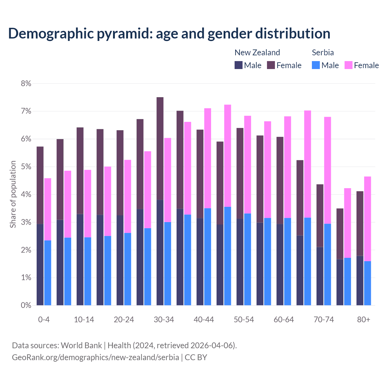 The share of older people aged 65 and over is 17.2% in New Zealand and 22.7% in Serbia. Life expectancy in New Zealand compared to Serbia .
