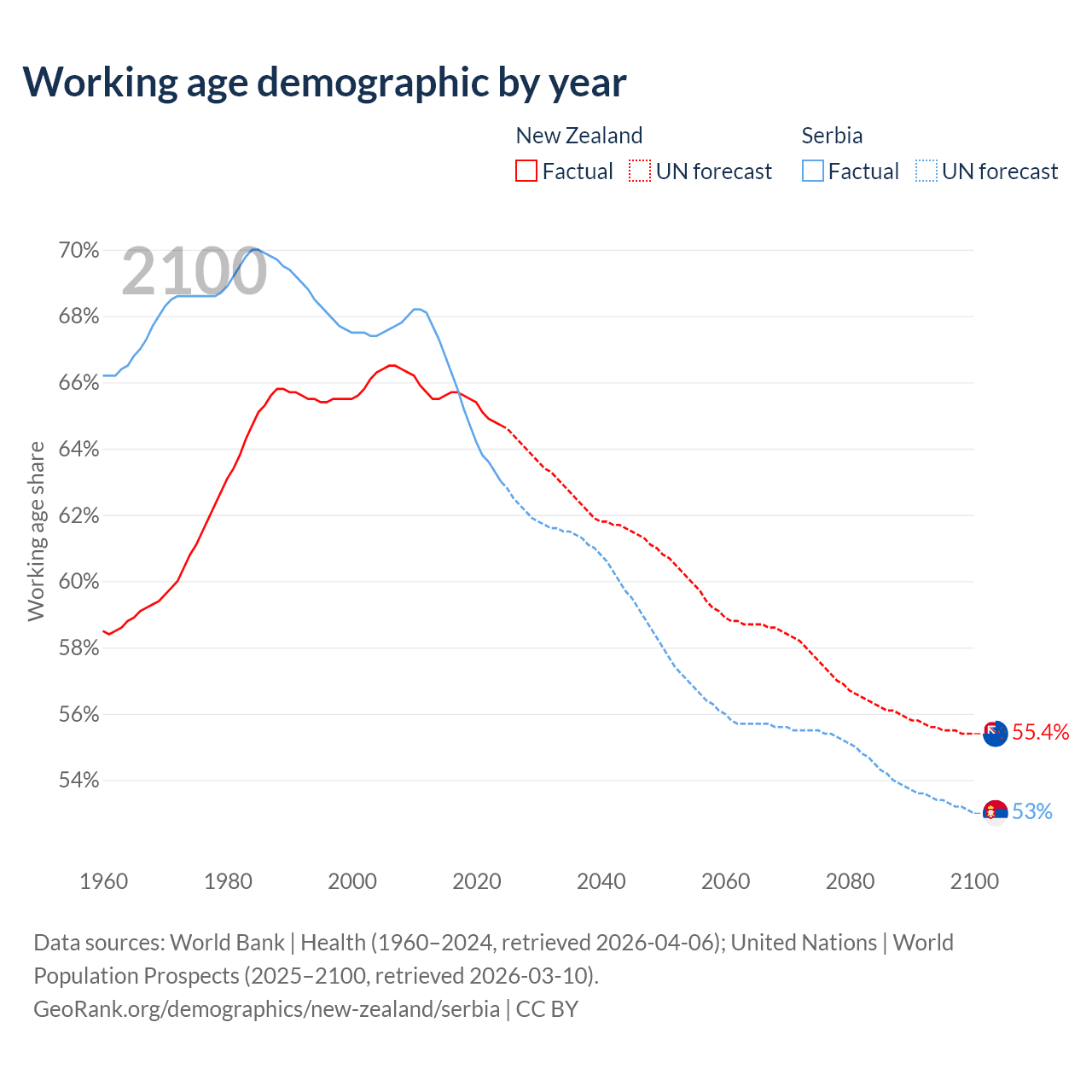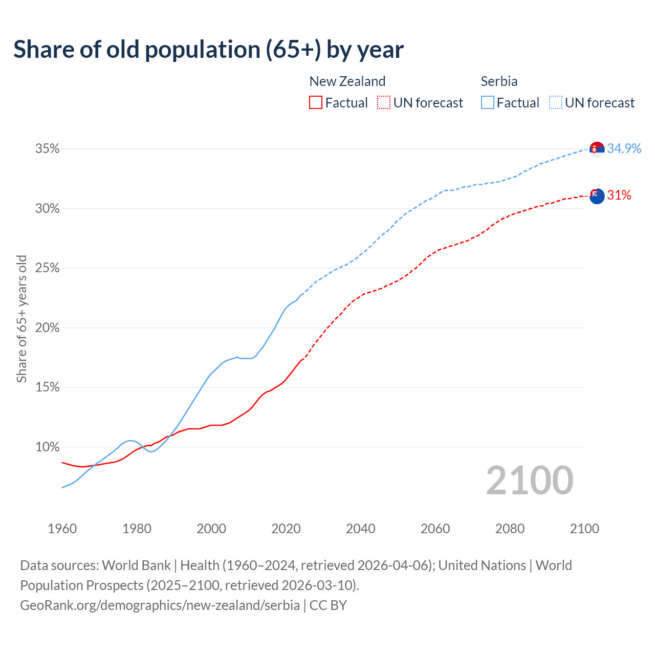 Median age New Zealand vs Serbia, 1960-2100