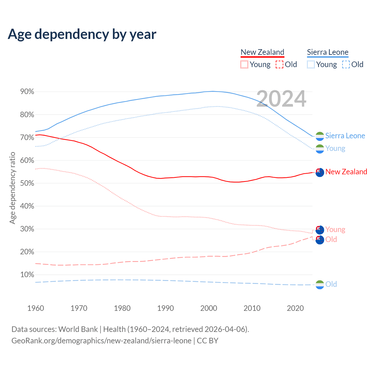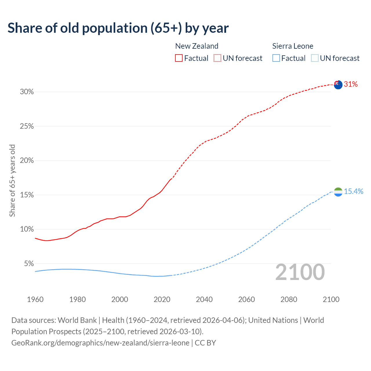 The share of older people aged 65 and over is 17.2% in New Zealand and 3.24% in Sierra Leone. Life expectancy in New Zealand compared to Sierra Leone .