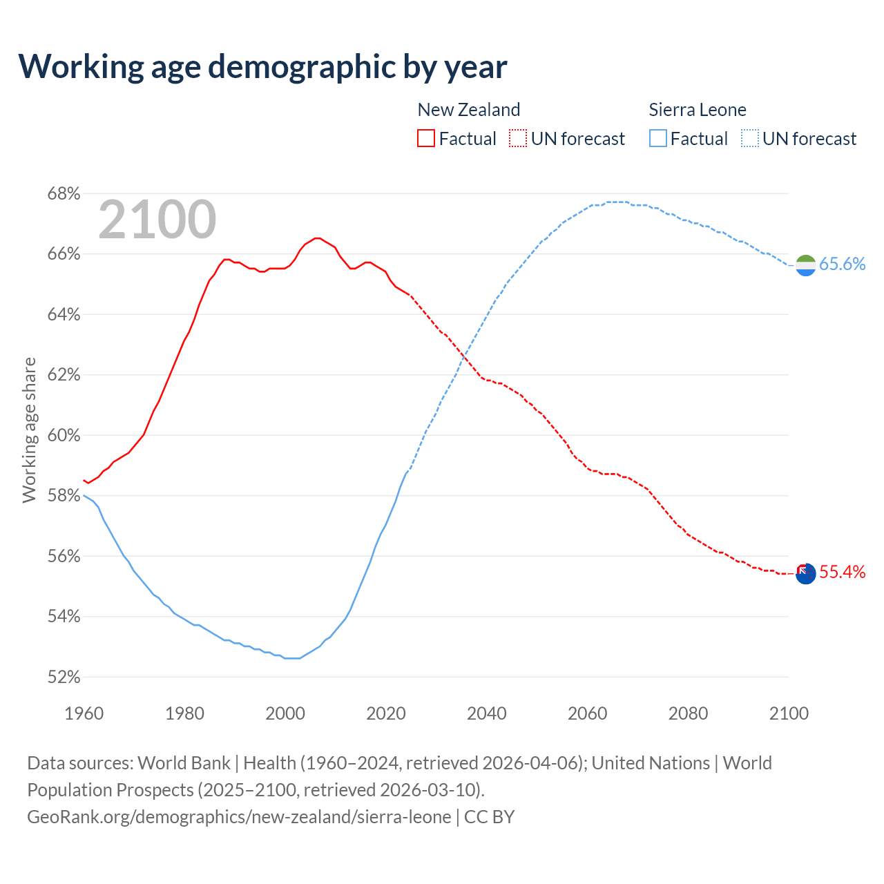 - New Zealand has 3.48M working age adults (aged 15-64) vs 5.31M in Sierra Leone.
