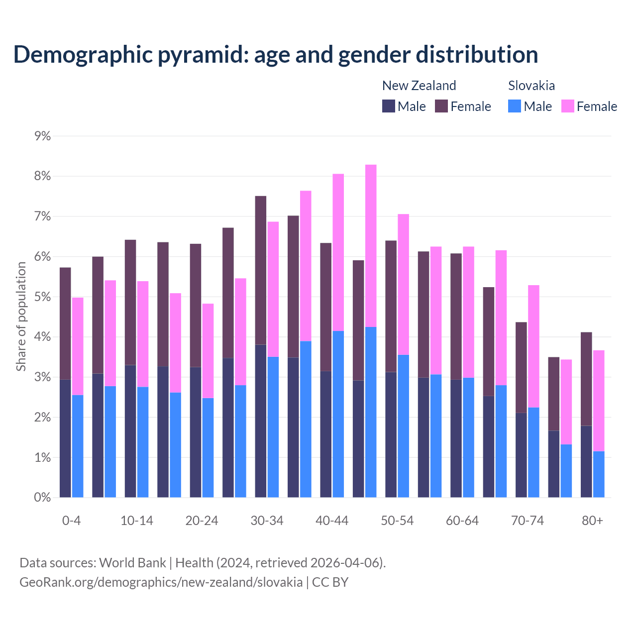 The share of older people aged 65 and over is 17.2% in New Zealand and 18.5% in Slovakia. Life expectancy in New Zealand compared to Slovakia .