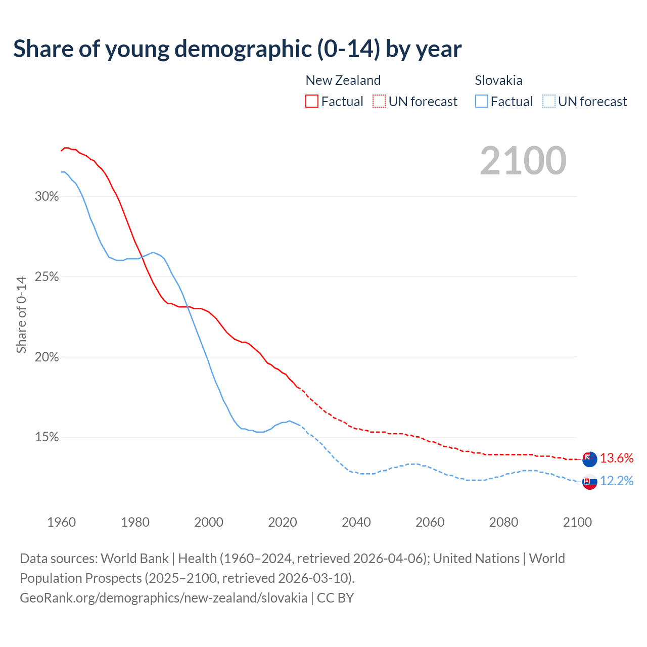 - The share of young demographic (0-15 years old) in New Zealand is 18.1% vs 15.8% in Slovakia.