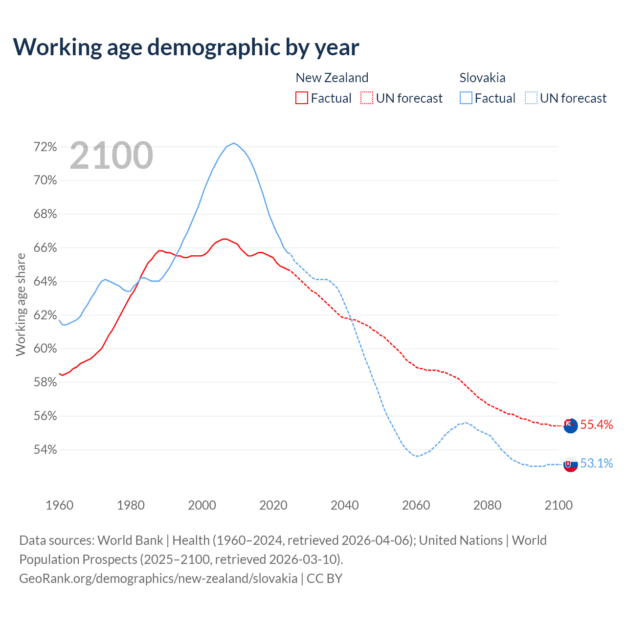 Median age New Zealand vs Slovakia, 1960-2100