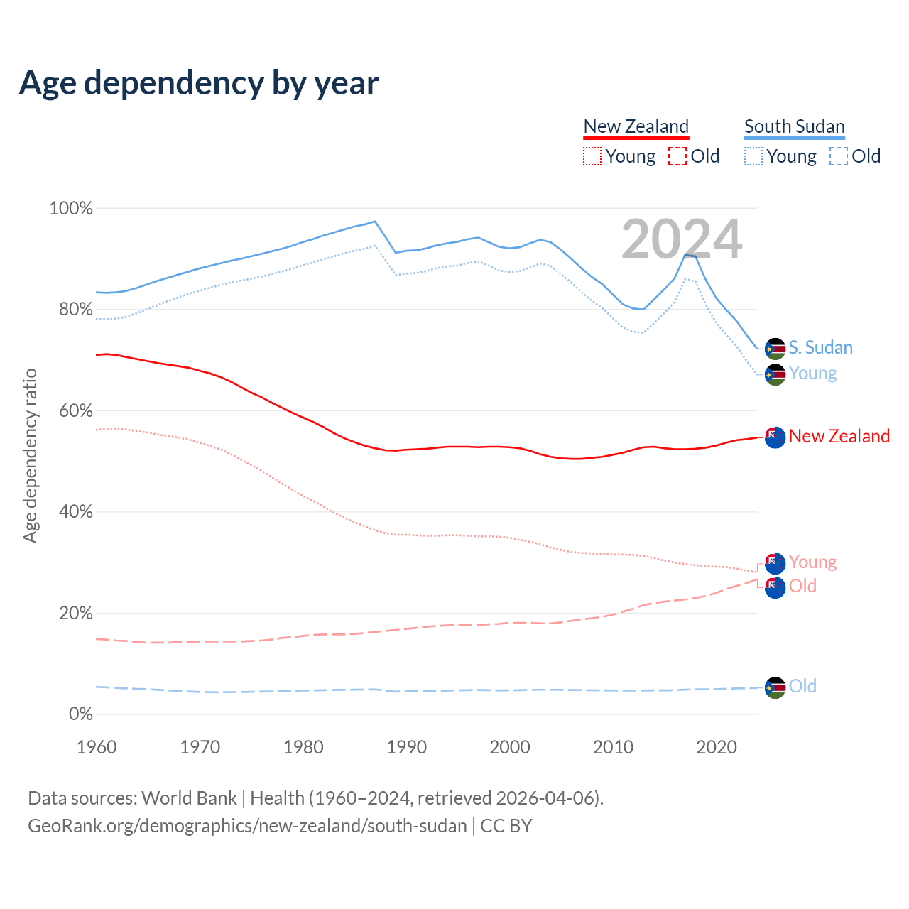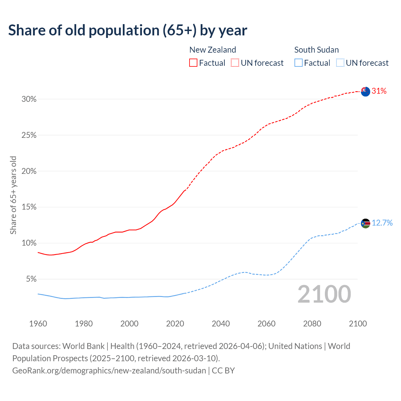 The share of older people aged 65 and over is 17.2% in New Zealand and 2.99% in South Sudan. Life expectancy in New Zealand compared to South Sudan .