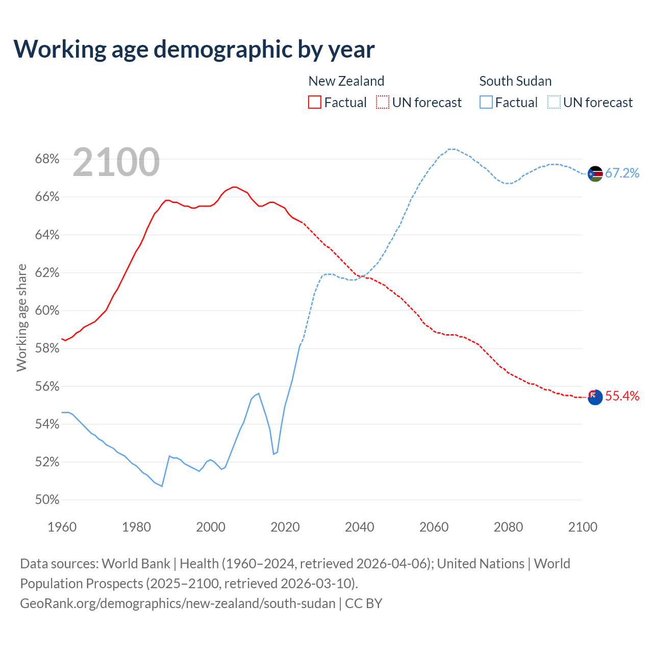 - New Zealand has 3.48M working age adults (aged 15-64) vs 7.27M in South Sudan.